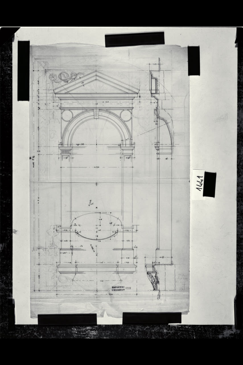 Prospetto e sezione dell’edicola della statua di S. Ambrogio per la Torre Umberto I del Castello Sforzesco di Milano. Prospetto e sezione dell’edicola della statua di S. Ambrogio per la Torre Umberto I del Castello Sforzesco di Milano