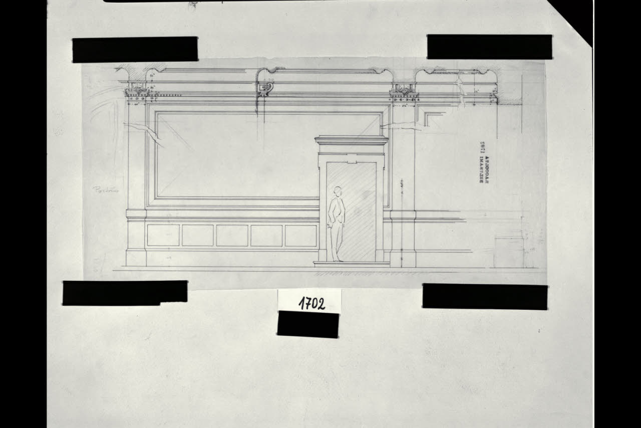 Milano, nuova sede del Corriere della Sera, via Solferino: Interno, prospetto e sezione di un androne. Milano, via Solferino, sede del "Corriere della Sera". Interno. Prospetto e sezione di un androne