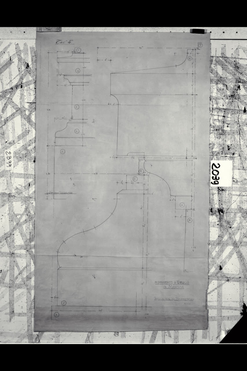 Mantova, Monumento commemorativo a Virgilio. Dettagli delle cornici e delle modanature. Sezioni. Mantova, Monumento commemorativo a Virgilio. Dettagli delle cornici e delle modanature. Sezioni