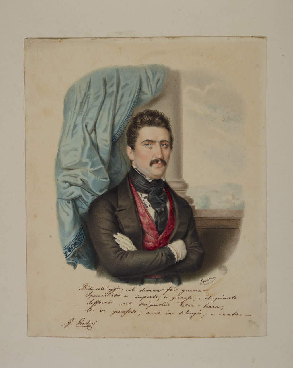 - NOTIZIE STORICO CRITICHE L'acquarello fa parte di una serie di ritratti raffiguranti alcuni amici dello scultore Pompeo Marchesi, realizzati da Giorgio Banchi verso la metà degli Quaranta dell'Ottocento e giunti nelle collezioni civiche milanesi grazie al legato Marchesi-Fogliani del 1862 (invv. Aggiunte 49-55). Il foglio ritrae Giovanni Prati, patriota e letterato trentino che sotto la propria effige vergò una dedica all'amico scultore (cfr. scheda di B. Falconi, in Trasparenze. L'acquarello tra Romanticismo e Belle Epoque 2011, p. 54 cat. 8).