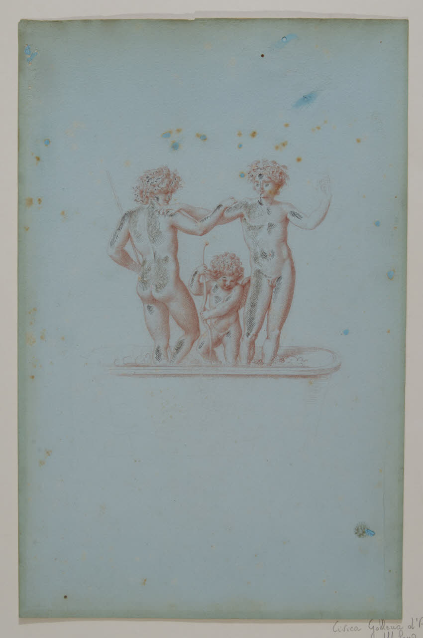 carta azzurra (incollata su cartoncino)/ sanguigna/ lumeggiature a biacca (ossidata)