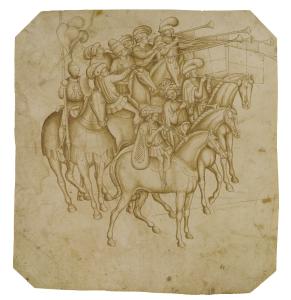 - NOTIZIE STORICO CRITICHE Il foglio è stato acquistato nel 1935 dalla Collezione Trivulzio. Secondo Suida (1936), il disegno è opera di un pittore e miniaturista lombardo del tempo di Filippo Maria Visconti, con una datazione attorno agli anni 30/40 del XV secolo. Berti Toesca (1939) sostiene che il foglio ricorda, nella maniera, un miniatore lombardo della metà del Quattrocento.