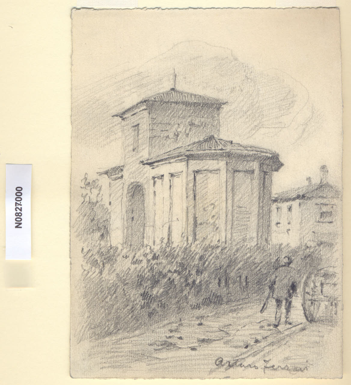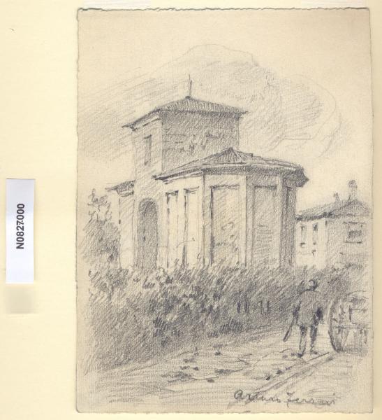 - NOTIZIE STORICO CRITICHE L'artista ha definito il disegno "A Lambrate" nella pagina manoscritta che accompagna il primo dei diciotto fascicoli della raccolta denominata "Vecchia Milano". L'attuale denominazione del luogo deriva dal fiume sul quale il vicus si trovava, il Lambro, cioè "pescoso", o limpido". È impossibile stabilire la data precisa di fondazione del vicus. Le strade che segnavano i confini del territorio lambratese erano due, la Milano-Bergamo, a nord, che partiva da porta Orientale, e la Milano-Brescia, a sud, con partenza da porta Tosa. Il confine orientale era il fiume stesso, mentre a Ovest il vicus arrivava all'attuale asse via Teodosio-Ponzio-Aselli. È con molta probabilità, inoltre, che Lambrate fosse porto fluviale per la vicina e più potente Mediolanum. Con il loro arrivo, i Romani sfruttarono la zona ricca di rogge per l'agricoltura e costruirono un sistema di navigazione fluviale intorno al fiume Po, ancora in vigore durante il medioevo. Durante l'VIII e il IX secolo sorsero a Lambrate due monasteri benedettini, dei quali sopravvive oggi la chiesa di San Martino (della chiesetta eretta nel XV secolo resta solo il campanile, nel 1913 la costruzione originaria fu completamente sostituita da un nuovo edificio destinato al culto) e la cascina Cavriana, che ingloba l'abside a emiciclo, ripartita da pilastrini in rilievo e coronata da archetti, già appartenente alla chiesa di Sant'Ambrogio prima del suo impiego ad uso rurale. Dai riscontri in loco non è stato possibile identificare l'edificio raffigurato da Ferrari, ma si può escludere che corrisponda all'attuale chiesa di San Martino in Lambrate o all'abside della chiesa di Sant'Ambrogio. Con la distruzione del 1162 di Milano ad opera di Federico Barbarossa, Lambrate venne elevata al rango di "borgo imperiale", e qui vennero accolti i milanesi in esilio da Porta Orientale. Con la dominazione spagnola, nel XVI secolo, viene costruita la prima industria bellica, la "Polveriera", che segnò la storia e la fortuna lambratese, al suo posto fu poi costruita, sotto Mussolini, una delle sedi dell'istituto dei Martinitt. Gli Spagnoli trasformarono il borgo in feudo, promulgandone la vendita, e tale condizione persisterà fino all'arrivo di Napoleone Bonaparte, quando Lambrate divenne libero comune. Alcuni decenni dopo, mentre a Milano veniva ultimata la facciata del Duomo, un decreto del viceré francese, nel gennaio del 1808, annetteva il comune di Lambrate alla città di Milano. Con gli austriaci nel 1816 Lambrate tornò indipendente e lo restò fino al dicembre 1923, anno in cui numerose frazioni periferiche vennero annesse al comune di Milano.\nLa vedova di Ferrari, proponendo i disegni all'attenzione del Comune di Milano, riconduceva la loro realizzazione agli ultimi anni di vita del marito. Una delle opere reca la data 1926; inoltre presso il Museo di Milano si conserva un'altra serie di 16 analoghe vedute a matita di Ferrari, datate dal 1924 al 1931. Pertanto si ritiene che la serie del Civico Gabinetto dei Disegni sia stata eseguita nell'arco cronologico dal 1924 al 1932. \nIn quell'epoca Milano stava conoscendo notevoli trasformazioni urbanistiche e il pittore, per contrastare la perdita di memoria provocata dalle demolizioni, decise di fissare nei suoi disegni gli angoli e gli scorci destinati a un radicale cambiamento.
