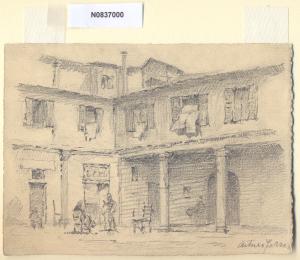 - NOTIZIE STORICO CRITICHE L'artista ha definito il disegno "In via Gorani" nella pagina manoscritta che accompagna il secondo dei diciotto fascicoli della raccolta denominata "Vecchia Milano". L'originaria denominazione del luogo era "Contrada dei Morigi" finchè nel Seicento vi si stabilì la nobile casata dei Gorani, trasferitasi da Pavia a Milano, e la via prese il nome della nuova famiglia. Nel 1669 Ignazio Gorani acquistò infatti dal conte Pietro Crivelli il palazzo che i suoi discendenti onorarono e abitarono, finchè nel 1769 Ferdinando lo vendette al conte Secco-Comneno, da cui passò per eredità all'Ospedale Maggiore. Fu poi dei Bazzaro-Mattei. Danneggiato dalle incursioni aeree del 1943, nel dopoguerra il palazzo venne abbattuto dalla speculazione edilizia imperversante. \nLa vedova di Ferrari, proponendo i disegni all'attenzione del Comune di Milano, riconduceva la loro realizzazione agli ultimi anni di vita del marito. Una delle opere reca la data 1926; inoltre presso il Museo di Milano si conserva un'altra serie di 16 analoghe vedute a matita di Ferrari, datate dal 1924 al 1931. Pertanto si ritiene che la serie del Civico Gabinetto dei Disegni sia stata eseguita nell'arco cronologico dal 1924 al 1932. \nIn quell'epoca Milano stava conoscendo notevoli trasformazioni urbanistiche e il pittore, per contrastare la perdita di memoria provocata dalle demolizioni, decise di fissare nei suoi disegni gli angoli e gli scorci destinati a un radicale cambiamento.
