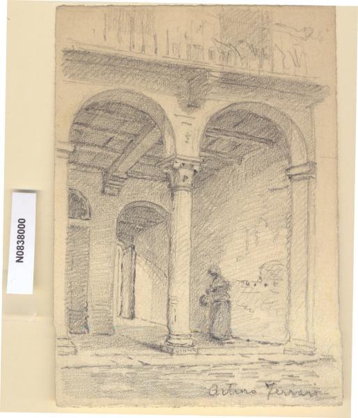- NOTIZIE STORICO CRITICHE L'artista ha definito il disegno "In Via del Bollo" nella pagina manoscritta che accompagna il secondo dei diciotto fascicoli della raccolta denominata "Vecchia Milano". La via trae nome dagli antichi uffici del Bollo che vi avevano sede. Con le vie del Bocchetto, Santa Marta, Santa Maria Fulcorina, e Santa Maria Podone forma un crocicchio detto "Le Cinque Vie", luogo molto antico, probabilmente adibito al traffico commerciale, la cui origine si fa risalire all'età imperiale, ma del quale resta solo la planimetria. \nLa vedova di Ferrari, proponendo i disegni all'attenzione del Comune di Milano, riconduceva la loro realizzazione agli ultimi anni di vita del marito. Una delle opere reca la data 1926; inoltre presso il Museo di Milano si conserva un'altra serie di 16 analoghe vedute a matita di Ferrari, datate dal 1924 al 1931. Pertanto si ritiene che la serie del Civico Gabinetto dei Disegni sia stata eseguita nell'arco cronologico dal 1924 al 1932. \nIn quell'epoca Milano stava conoscendo notevoli trasformazioni urbanistiche e il pittore, per contrastare la perdita di memoria provocata dalle demolizioni, decise di fissare nei suoi disegni gli angoli e gli scorci destinati a un radicale cambiamento.