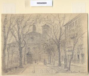 - NOTIZIE STORICO CRITICHE L'artista ha definito il disegno "A S. Nazaro" nella pagina manoscritta che accompagna il terzo dei diciotto fascicoli della raccolta denominata "Vecchia Milano". L'attuale denominazione del luogo è piazza San Nazaro in brolo. La piazza trae nome dall'omonima basilica di origine antichissima, fondata da Ambrogio nel 382, che sorgeva ai margini di quella striscia di bosco e insieme giardino, detta brolo nel Medioevo; da qui il nome di San Nazaro in Brolo quando il vescovo Ambrogio vi collocò nel 396 il corpo rinvenuto di San Nazaro, martire con Celso sotto Nerone. La basilica, pur avendo subito ampie trasformazioni nel corso dei secoli, ha nel complesso mantenuto l'originario impianto paleocristiano. A partire dal 1512 alla facciata di San Nazaro si aggiunse la Cappella Trivulzio, voluta da Gian Giacomo Trivulzio come mauseoleo per sè e per la sua famiglia; la cappella ha forma di alto parallelepipedo in cotto, a base quadrata, di semplici forme classiche, con pareti esterne spoglie contrassegnate soltanto da due ordini, mentre all'interno sviluppa una pianta ottagonale. Nel 1540 circa affianco alla basilica fu eretta la chiesa di Santa Caterina, che poi diverrà cappella della basilica e sarà posta in comunicazione ad essa mediante l'apertura di una porta. Il grande prestigio di cui godette San Nazaro è testimoniato dal fatto che vi furono tumulati numerosi vescovi di Milano. \nLa vedova di Ferrari, proponendo i disegni all'attenzione del Comune di Milano, riconduceva la loro realizzazione agli ultimi anni di vita del marito. Una delle opere reca la data 1926; inoltre presso il Museo di Milano si conserva un'altra serie di 16 analoghe vedute a matita di Ferrari, datate dal 1924 al 1931. Pertanto si ritiene che la serie del Civico Gabinetto dei Disegni sia stata eseguita nell'arco cronologico dal 1924 al 1932. \nIn quell'epoca Milano stava conoscendo notevoli trasformazioni urbanistiche e il pittore, per contrastare la perdita di memoria provocata dalle demolizioni, decise di fissare nei suoi disegni gli angoli e gli scorci destinati a un radicale cambiamento.