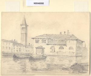 - NOTIZIE STORICO CRITICHE L'artista ha definito il disegno "Darsena" nella pagina manoscritta che accompagna il terzo dei diciotto fascicoli della raccolta denominata "Vecchia Milano". Prima della radicale riforma effettuata tra il 1919 e il 1920 dall'azienda portuale di Milano, la Darsena era il porto della città, al quale approdavano i marmi e le pietre per la costruzione dei più importanti monumenti cittadini; raccoglieva le acque dal Ticino, dall'Adda e dall'Olona e vi confluivano tre considerevoli vie d'acqua: il Naviglio alla Martesana, il Naviglio Grande e il Naviglio Pavese.\nLa veduta inquadra anche il campanile della basilica di Sant'Eustorgio.\nIn origine i Navigli costituivano la fossa interna che assurgeva al compito di arteria urbana per il traffico natante e cingeva la parte più cospicua della città. La zona appare oggi del tutto diversa e le principali trasformazioni risalgono alla seconda metà del XIX secolo, quando, in seguito all'introduzione dei tram, si iniziò a ipotizzare la copertura dei tratti cittadini dei Navigli. Nel 1891 il primo segmento della fossa interna ad essere sacrificato fu quello occidentale, il cosiddetto Naviglio di San Gerolamo; a partire dal 1929 i lavori di copertura ripresero con sistematicità ininterrotta fino al 1930/1931. Attualmente il termine "Navigli", a Milano, identifica i due tratti scoperti del Naviglio Grande (fra le odierne Ripa di Porta Ticinese e l'Alzaia Naviglio Grande, in direzione di via Lodovico il Moro per Buccinasco e Corsico) e del Naviglio Pavese (fra via Ascanio Sforza e l'Alzaia Naviglio Pavese lungo via Chiesa Rossa per raggiungere Rozzano e collegarsi alla Strada dei Giovi) che si insinuano in città fino all'altezza di piazza XXIV Maggio e in senso più generale l'area compresa fra i due Navigli.\nLa vedova di Ferrari, proponendo i disegni all'attenzione del Comune di Milano, riconduceva la loro realizzazione agli ultimi anni di vita del marito. Una delle opere reca la data 1926; inoltre presso il Museo di Milano si conserva un'altra serie di 16 analoghe vedute a matita di Ferrari, datate dal 1924 al 1931. Pertanto si ritiene che la serie del Civico Gabinetto dei Disegni sia stata eseguita nell'arco cronologico dal 1924 al 1932. \nIn quell'epoca Milano stava conoscendo notevoli trasformazioni urbanistiche e il pittore, per contrastare la perdita di memoria provocata dalle demolizioni, decise di fissare nei suoi disegni gli angoli e gli scorci destinati a un radicale cambiamento.