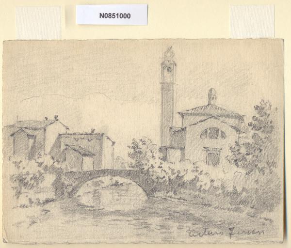- NOTIZIE STORICO CRITICHE L'artista ha definito il disegno "Alla Barona" nella pagina manoscritta che accompagna il quarto dei diciotto fascicoli della raccolta denominata "Vecchia Milano". A proposito del foglio in esame si segnala, per l'affinità del punto di ripresa, un'analoga veduta a matita eseguita dallo stesso Ferrari, attualmente conservata presso il Museo di Milano, che reca l'ntitolazione autografa "La Barona" e la datazione "1927" (inv. 86). Il disegno in esame è l'unico della serie del Gabinetto dei Disegni che reca sul verso la datazione, indicata dallo stesso autore, e corrispondente al 1926. La vedova di Ferrari, proponendo i disegni all'attenzione del Comune di Milano, riconduceva la loro realizzazione agli ultimi anni di vita del marito; inoltre presso il Museo di Milano si conserva un'altra serie di 16 analoghe vedute a matita di Ferrari, datate dal 1924 al 1931. Pertanto si ritiene che la serie del Civico Gabinetto dei Disegni sia stata eseguita nell'arco cronologico dal 1924 al 1932. \nL'attuale ubicazione della chiesa dedicata ai "Santi Nazaro e Celso" è via Zumbini, 19. La chiesa, esistente in Barona probabilmente fin dal secolo XIV, serviva come luogo di culto, in particolare per la celebrazione della santa Messa domenicale, per gli sparsi abitanti della vastissima zona periferica. Il titolo della chiesa deriva dai numerosi fondi agricoli e probabilmente dalla stessa cascina Barona che appartenevano ai monaci benedettini del Monastero di San Celso. La distanza dalla chiesa parrocchiale gravava sulla popolazione della zona che andava crescendo numericamente; nel 1567 una delegazione di cittadini si recò dall'Arcivescovo Carlo Borromeo chiedendo che la loro chiesa fosse elevata a chiesa parrocchiale con un sacerdote stabilmente in luogo, fu così che la vecchia chiesina divenne finalmente parrocchia conservando la primitiva dedica ai santi Nazaro e Celso. Incendiatasi nel 1897, la chiesa venne ricostruita e consacrata il primo aprile 1900.\nAttualmente la Barona è prevalentemente una zona residenziale la cui morfologia è delimitata dai due Navigli (Pavese e Grande) ad est ed ovest, dal Parco Agricolo Sud a sud e dalla circonvallazione esterna (viale Cassala e Tibaldi) a nord. Rispetto alla Milano romana, la Barona era situata nel cosiddetto Pomerio che corrispondeva al territorio esterno alle mura della città (post muras); il Pomerio assunse in seguito il nome di Comune di Corpi Santi, perchè anticamente vi venivano seppelliti i morti che per ragioni igieniche erano sempre inumati fuori dalle mura. \nLa zona era (ed è ancora) ricchissima d'acqua in quanto dai Navigli era stata derivata una fitta rete di canali, sussidio indispensabile delle fertili risaie. Fino alla prima guerra mondiale il territorio è rimasto pressochè agricolo, mentre nell' immediato dopoguerra ha cominciato ad essere invaso da centinaia di piccole e medie industrie.\nIl pittore, per contrastare la perdita di memoria provocata dalle trasformazioni urbanistiche in atto a Milano, decise di fissare nei suoi disegni gli angoli e gli scorci destinati a un radicale cambiamento.