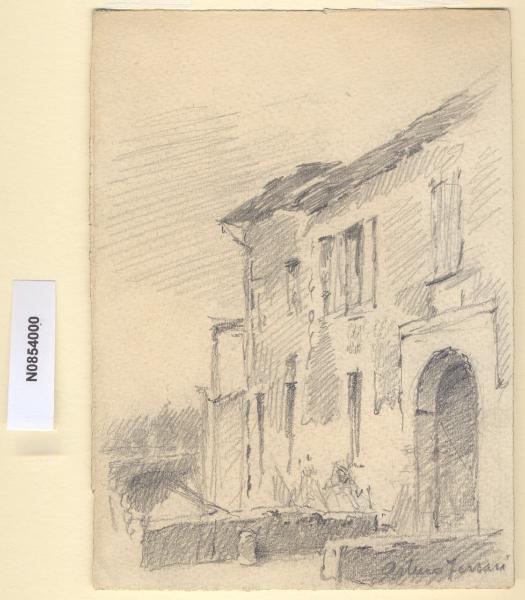 - NOTIZIE STORICO CRITICHE L'artista ha definito il disegno "A S. Cristoforo" nella pagina manoscritta che accompagna il quarto dei diciotto fascicoli della raccolta denominata "Vecchia Milano". La chiesa si trova nella via omonima sull'Alzaia del Naviglio Grande. La via prende il nome dalla chiesa eretta tra il XIII e il XV secolo sull'Alzaia del Naviglio Grande e intitolata a San Cristoforo, protettore contro l'infierire delle pestilenze. Alla chiesa gotica si affiancava un ospedale per i pellegrini, costruito all'incirca dal 1364 e altre modeste costruzioni. Il disegno in esame, raffigurando queste ultime, dimostra come l'artista preferisse soffermare il proprio ricordo sulle architetture umili piuttosto che sulle parti monumentali di un isolato.\nLa vedova di Ferrari, proponendo i disegni all'attenzione del Comune di Milano, riconduceva la loro realizzazione agli ultimi anni di vita del marito. Una delle opere reca la data 1926; inoltre presso il Museo di Milano si conserva un'altra serie di 16 analoghe vedute a matita di Ferrari, datate dal 1924 al 1931. Pertanto si ritiene che la serie del Civico Gabinetto dei Disegni sia stata eseguita nell'arco cronologico dal 1924 al 1932. \nIn quell'epoca Milano stava conoscendo notevoli trasformazioni urbanistiche e il pittore, per contrastare la perdita di memoria provocata dalle demolizioni, decise di fissare nei suoi disegni gli angoli e gli scorci destinati a un radicale cambiamento.