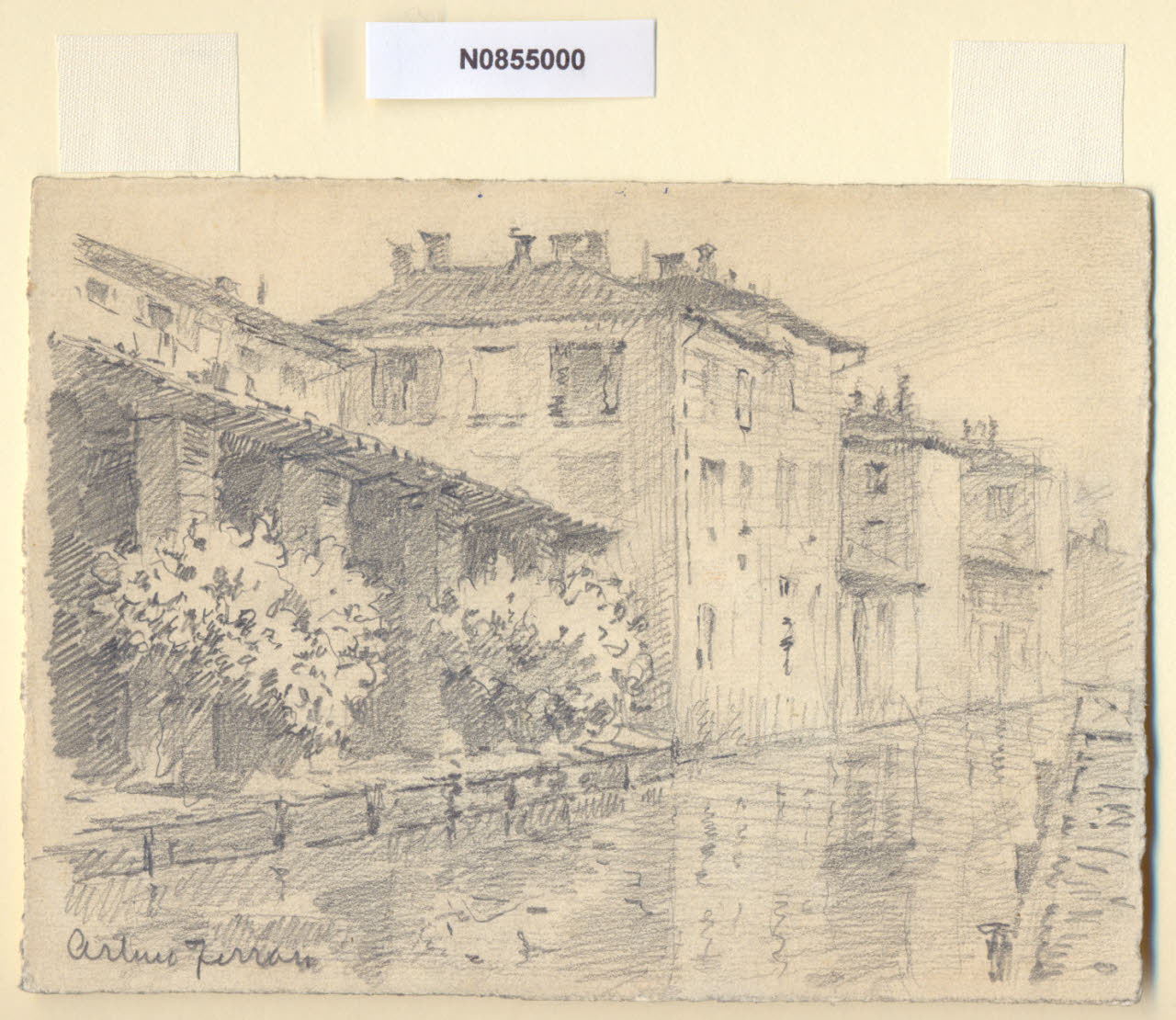 - NOTIZIE STORICO CRITICHE L'artista ha definito il disegno "Naviglio a P. Ticinese" nella pagina manoscritta che accompagna il quarto dei diciotto fascicoli della raccolta denominata "Vecchia Milano". A proposito del foglio in esame si segnala, per l'affinità del taglio compositivo, un'analoga veduta a matita eseguita dallo stesso Ferrari, attualmente conservata presso il Museo di Milano, intitolata "Al ponte di porta Ticinese" e che reca la datazione "1924" (inv. 88); pertanto è ipotizzabile, considerata l'estrema affinità di soggetto delle due vedute, che il disegno in esame sia stato eseguito attorno a tale data. Il disegno raffigura quella che un tempo veniva definita "sostra", termine dialettale derivante dal latino "sosta", che indicava deposito di legname e pietre lungo la fossa interna del Naviglio; l'utilizzo di questi magazzini risaliva alla navigazione dei barconi che portavano dal Lago Maggiore e dall'Adda svariati materiali attraverso il Naviglio della Martesana. Dai riscontri in loco si ipotizza che l'attuale ubicazione degli edifici scorciati dal Ferrari corrisponda a via Molino delle Armi, per la vicinanza delle case all'acqua del Naviglio della fossa interna; si tratta soltanto di supposizioni poichè la zona appare oggi del tutto diversa e le principali trasformazioni risalgono alla seconda metà del XIX secolo, quando, in seguito all'introduzione dei tram, si iniziò a progettare la copertura dei tratti cittadini dei Navigli. Nel 1891 il primo segmento della fossa interna ad essere sacrificato fu quello occidentale, il cosiddetto Naviglio di San Gerolamo; a partire dal 1929 i lavori di copertura ripresero con sistematicità ininterrotta fino al 1930/1931. Attualmente il termine "Navigli", a Milano, identifica i due tratti scoperti del Naviglio Grande (fra le odierne Ripa di Porta Ticinese e l'Alzaia Naviglio Grande, in direzione di via Lodovico il Moro per Buccinasco e Corsico) e del Naviglio Pavese (fra via Ascanio Sforza e l'Alzaia Naviglio Pavese lungo via Chiesa Rossa per raggiungere Rozzano e collegarsi alla Strada dei Giovi) che si insinuano in città fino all'altezza di piazza XXIV Maggio e in senso più generale l'area compresa fra i due Navigli.\nIl pittore, per contrastare la perdita di memoria provocata dalle trasformazioni urbanistiche in atto a Milano, decise di fissare nei suoi disegni gli angoli e gli scorci destinati a un radicale cambiamento.