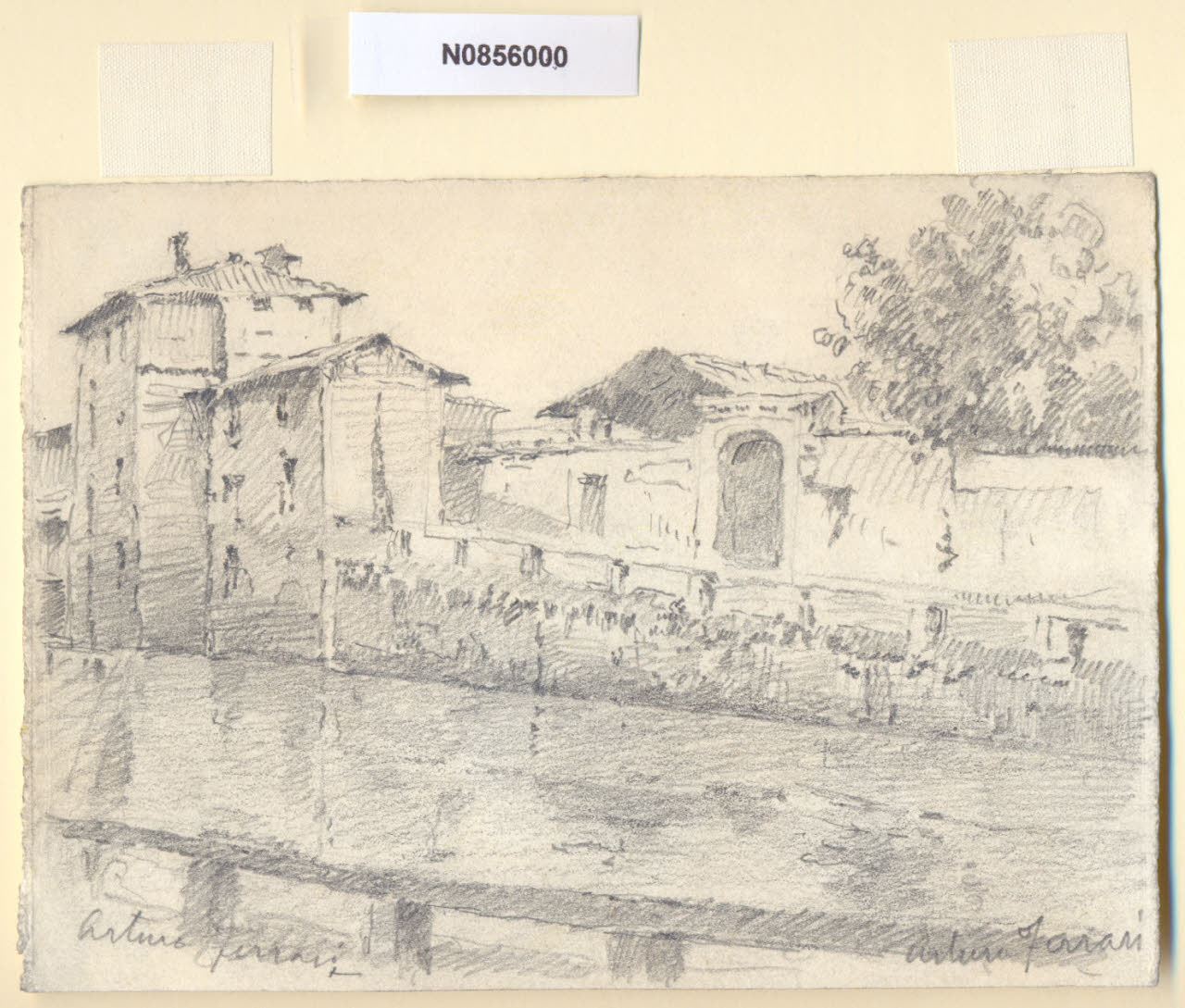 - NOTIZIE STORICO CRITICHE L'artista ha definito il disegno "Naviglio Vallone" nella pagina manoscritta che accompagna il quarto dei diciotto fascicoli della raccolta denominata "Vecchia Milano". \nL'edificio più alto (vestigia di una torre) è probabilmente un residuo di quel recinto chiamato Cittadella, fatto edificare da Azzone Visconti (1330-39) per racchiudere il borgo di Sant'Eustorgio. Tale recinzione aveva origine accanto alla Pusterla dei Fabbri, seguiva il Naviglio di via Vallone, ripiegava lungo il Ticinello, risaliva lungo via Santa Croce e si univa alle mura in corrispondenza di via Chiusa. Il nome stesso di via Vallone ricorda il muro ("vallum") o bastione difensivo di questa nuova cerchia supplementare. Via Vallone è attualmente denominata via Conca del Naviglio. In origine i Navigli costituivano la fossa interna che assurgeva al compito di arteria urbana per il traffico natante e cingeva la parte più cospicua della città. \nLa zona appare oggi del tutto diversa e le principali trasformazioni risalgono alla seconda metà del XIX secolo, quando, in seguito all'introduzione dei tram, si iniziò a ipotizzare la copertura dei tratti cittadini dei Navigli. Nel 1891 il primo segmento della fossa interna ad essere sacrificato fu quello occidentale, il cosiddetto Naviglio di San Gerolamo; a partire dal 1929 i lavori di copertura ripresero con sistematicità ininterrotta fino al 1930/1931. Attualmente il termine "Navigli", a Milano, identifica i due tratti scoperti del Naviglio Grande (fra le odierne Ripa di Porta Ticinese e l'Alzaia Naviglio Grande, in direzione di via Lodovico il Moro per Buccinasco e Corsico) e del Naviglio Pavese (fra via Ascanio Sforza e l'Alzaia Naviglio Pavese lungo via Chiesa Rossa per raggiungere Rozzano e collegarsi alla Strada dei Giovi) che si insinuano in città fino all'altezza di piazza XXIV Maggio e in senso più generale l'area compresa fra i due Navigli.\nLa vedova di Ferrari, proponendo i disegni all'attenzione del Comune di Milano, riconduceva la loro realizzazione agli ultimi anni di vita del marito. Una delle opere reca la data 1926; inoltre presso il Museo di Milano si conserva un'altra serie di 16 analoghe vedute a matita di Ferrari, datate dal 1924 al 1931. Pertanto si ritiene che la serie del Civico Gabinetto dei Disegni sia stata eseguita nell'arco cronologico dal 1924 al 1932. \nIn quell'epoca Milano stava conoscendo notevoli trasformazioni urbanistiche e il pittore, per contrastare la perdita di memoria provocata dalle demolizioni, decise di fissare nei suoi disegni gli angoli e gli scorci destinati a un radicale cambiamento.