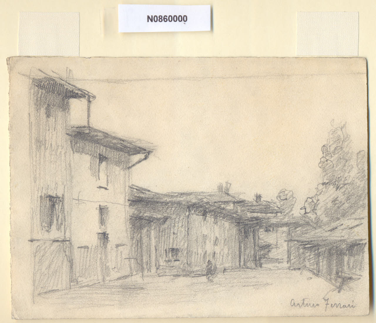 - NOTIZIE STORICO CRITICHE L'artista ha definito il disegno "Alla Magolfa" nella pagina manoscritta che accompagna il quinto dei diciotto fascicoli della raccolta denominata "Vecchia Milano". Un'antica strada fuori delle mura spagnole da Porta Ticinese conduceva ad un agglomerato di case rustiche chiamato "Magolfa", disposte attorno alla seicentesca chiesetta di Santa Maria del Sasso. Alcuni ipotizzano che la contrada risalga all'epoca longobarda e che tragga la sua denominazione da un nome proprio come Ghisulfo o Vidigulfo. Altra plausibile ipotesi è che il nome derivi dall'antico termine del dialetto milanese "magòlc" che significa stagno o pantano, quindi località acquitrinosa.\nLa vedova di Ferrari, proponendo i disegni all'attenzione del Comune di Milano, riconduceva la loro realizzazione agli ultimi anni di vita del marito. Una delle opere reca la data 1926; inoltre presso il Museo di Milano si conserva un'altra serie di 16 analoghe vedute a matita di Ferrari, datate dal 1924 al 1931. Pertanto si ritiene che la serie del Civico Gabinetto dei Disegni sia stata eseguita nell'arco cronologico dal 1924 al 1932. \nIn quell'epoca Milano stava conoscendo notevoli trasformazioni urbanistiche e il pittore, per contrastare la perdita di memoria provocata dalle demolizioni, decise di fissare nei suoi disegni gli angoli e gli scorci destinati a un radicale cambiamento.