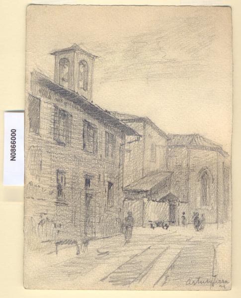 - NOTIZIE STORICO CRITICHE L'artista ha definito il disegno "A S. Giovanni Laterano" nella pagina manoscritta che accompagna il quinto dei diciotto fascicoli della raccolta denominata "Vecchia Milano". La zona appare oggi del tutto diversa e le principali trasformazioni, allo studio sin dal 1930, risalgono al 1936 quando venne demolita l'antica parrocchiale posta tra contrada del Pesce (oggi via Paolo da Cannobio) e via dei Tre Alberghi (piazza Diaz), in vista del risanamento del quartiere malfamato del Bottonuto. \nLa chiesa, parrocchiale già dal 1388, nacque col nome di San Giovanni Isolano, perchè cinta dalle acque del Seveso. L'originario attributo Isolano fu poi sostituito con Laterano, probabilmente poichè papa Leone X concesse alla chiesa le medesime indulgenze accordate a San Giovanni Laterano a Roma, oppure, come sostiene Vittoro Caprara (cfr. Milano, le chiese scomparse, Milano, 1998, vol. II, p.293), per una semplice alterazione del nome compiutasi negli anni. A fine Ottocento la chiesa venne chiusa al culto e durante la prima guerra mondiale trasformata in magazzino militare. Nuovamente chiusa al culto nel 1934, venne definitivamente demolita, non senza aspre polemiche, nel 1936, in adempimento alle direttive del Piano Regolatore, incurante di quella struttura allora considerata monumento nazionale. Nel frattempo nel 1934 venne costruita in via Pinturicchio 35 una nuova chiesa che prese nome dall'antica parrocchiale.\nLa vedova di Ferrari, proponendo i disegni all'attenzione del Comune di Milano, riconduceva la loro realizzazione agli ultimi anni di vita del marito. Una delle opere reca la data 1926; inoltre presso il Museo di Milano si conserva un'altra serie di 16 analoghe vedute a matita di Ferrari, datate dal 1924 al 1931. Pertanto si ritiene che la serie del Civico Gabinetto dei Disegni sia stata eseguita nell'arco cronologico dal 1924 al 1932. \nIn quell'epoca Milano stava conoscendo notevoli trasformazioni urbanistiche e il pittore, per contrastare la perdita di memoria provocata dalle demolizioni, decise di fissare nei suoi disegni gli angoli e gli scorci destinati a un radicale cambiamento.