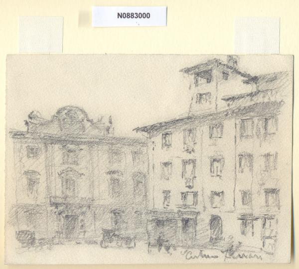 - NOTIZIE STORICO CRITICHE L'artista ha definito il disegno "Via Nirone" nella pagina manoscritta che accompagna il settimo dei diciotto fascicoli della raccolta denominata "Vecchia Milano". L'attuale denominazione del luogo deriva dal corso d'acqua Nirone (o Nerone o Nilone) che nel giro delle mura antiche e, precisamente nel tratto aggiunto da Ansperto, scorreva lungo il lato di levante della contrada. Dal 1929 al 1945 fu detta via del Fascio quando vi fu costruito il palazzo, eretto nel 1926 dall'architetto Paolo Mezzanotte, che fu la prima sede della Federazione dei Fasci milanesi.\nL'edificio che si scorge nella veduta è palazzo Litta ubicato allo sbocco di via Nirone su corso Magenta, edificato dal Richini per il conte Arese, divenne in seguito proprietà dei Borromeo, dei Visconti e infine dei Litta che lo ingrandirono e arricchirono nel corso degli anni; la facciata rococò venne progettata da Bartolomeo Bolla tra il 1752 e il 1763.\nLa vedova di Ferrari, proponendo i disegni all'attenzione del Comune di Milano, riconduceva la loro realizzazione agli ultimi anni di vita del marito. Una delle opere reca la data 1926; inoltre presso il Museo di Milano si conserva un'altra serie di 16 analoghe vedute a matita di Ferrari, datate dal 1924 al 1931. Pertanto si ritiene che la serie del Civico Gabinetto dei Disegni sia stata eseguita nell'arco cronologico dal 1924 al 1932. \nIn quell'epoca Milano stava conoscendo notevoli trasformazioni urbanistiche e il pittore, per contrastare la perdita di memoria provocata dalle demolizioni, decise di fissare nei suoi disegni gli angoli e gli scorci destinati a un radicale cambiamento.