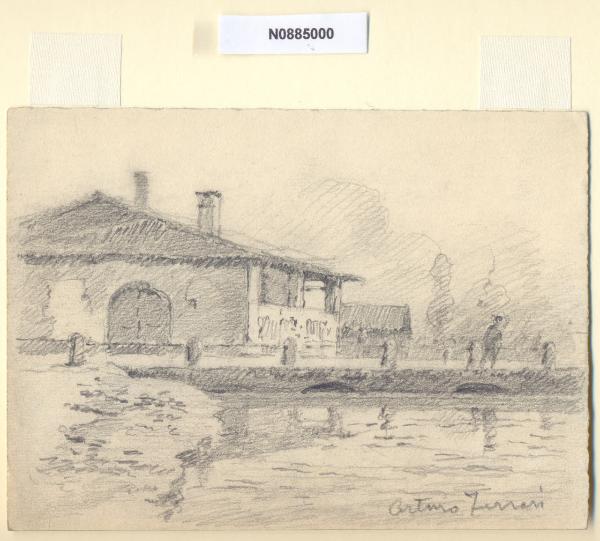 - NOTIZIE STORICO CRITICHE L'artista ha definito il disegno "A Lambrate" nella pagina manoscritta che accompagna il settimo dei diciotto fascicoli della raccolta denominata "Vecchia Milano". L'attuale denominazione del luogo deriva dal fiume sul quale il vicus si trovava, il Lambro, cioè "pescoso", o limpido". È impossibile stabilire la data precisa di fondazione del vicus. Le strade che segnavano i confini del territorio lambratese erano due, la Milano-Bergamo, a nord, che partiva da porta Orientale, e la Milano-Brescia, a sud, con partenza da porta Tosa. Il confine orientale era il fiume stesso, mentre a Ovest il vicus arrivava all'attuale asse via Teodosio-Ponzio-Aselli. È con molta probabilità, inoltre, che Lambrate fosse porto fluviale per la vicina e più potente Mediolanum. Con il loro arrivo, i Romani sfruttarono la zona ricca di rogge per l'agricoltura e costruirono un sistema di navigazione fluviale intorno al fiume Po, ancora in vigore durante il medioevo. Durante l'VIII e il IX secolo sorsero a Lambrate due monasteri benedettini, dei quali sopravvive oggi la chiesa di San Martino (della chiesetta eretta nel XV secolo resta solo il campanile, nel 1913 la costruzione originaria fu completamente sostituita da un nuovo edificio destinato al culto) e la cascina Cavriana, dove l'abside a emiciclo, ripartito da pilastrini in rilevo e coronato da archetti, in origine parte della chiesa di Sant'Ambrogio, è attualmente adibito a fienile. Con la distruzione del 1162 di Milano ad opera di Federico Barbarossa, Lambrate venne elevata al rango di "borgo imperiale", e qui vennero accolti i milanesi in esilio da Porta Orientale. Con la dominazione spagnola, nel XVI secolo, viene costruita la prima industria bellica , la "Polveriera", che segnò la storia e la fortuna lambratese, al suo posto fu poi costruita, sotto Mussolini, una delle sedi dell'istituto dei Martinitt. Gli Spagnoli trasformarono il borgo in feudo, promulgandone la vendita, e tale condizione persisterà fino all'arrivo di Napoleone Bonaparte, quando Lambrate divenne libero comune. Alcuni decenni dopo, mentre a Milano veniva ultimata la facciata del Duomo, un decreto del viceré francese, nel gennaio del 1808, annetteva il comune di Lambrate alla città di Milano. Con gli austriaci nel 1816 Lambrate tornò indipendente e lo restò fino al dicembre 1923, anno in cui numerose frazioni periferiche vennero annesse al comune di Milano.\nLa vedova di Ferrari, proponendo i disegni all'attenzione del Comune di Milano, riconduceva la loro realizzazione agli ultimi anni di vita del marito. Una delle opere reca la data 1926; inoltre presso il Museo di Milano si conserva un'altra serie di 16 analoghe vedute a matita di Ferrari, datate dal 1924 al 1931. Pertanto si ritiene che la serie del Civico Gabinetto dei Disegni sia stata eseguita nell'arco cronologico dal 1924 al 1932. \nIn quell'epoca Milano stava conoscendo notevoli trasformazioni urbanistiche e il pittore, per contrastare la perdita di memoria provocata dalle demolizioni, decise di fissare nei suoi disegni gli angoli e gli scorci destinati a un radicale cambiamento.