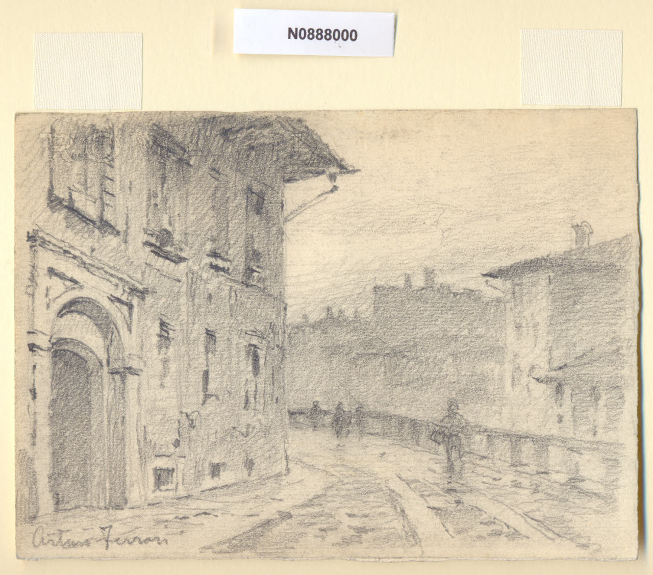 - NOTIZIE STORICO CRITICHE L'artista ha definito il disegno "A S. Sofia" nella pagina manoscritta che accompagna il settimo dei diciotto fascicoli della raccolta denominata "Vecchia Milano". La via trae nome da una chiesa con annesso monastero, in origine detto di Santa Maria degli Angeli e attualmente denominato di Santa Maria della Visitazione, che, nel 1578, San Carlo destinò alle fanciulle rimaste orfane in seguito alla pestilenza del 1576, ponendolo sotto la protezione di Santa Sofia. Sofia fu una ricca vedova milanese, convertita al cristianesimo dal vescovo di Milano San Caio alla fine del I sec. d.C., che, recatasi a Roma con le tre figlie, venne martirizzata sulla via Aurelia. Le principali trasformazioni della zona risalgono al 1929 quando venne interrato il Naviglio, costruito nel Medioevo a protezione della città, che iniziava dal Ponte di Porta Romana e che correva lungo questa via. In origine i Navigli costituivano la fossa interna che assurgeva al compito di arteria urbana per il traffico natante e cingeva la parte più cospicua della città. Attualmente il termine "Navigli", a Milano, identifica i due tratti scoperti del Naviglio Grande (fra le odierne Ripa di Porta Ticinese e l'Alzaia Naviglio Grande, in direzione di via Lodovico il Moro per Buccinasco e Corsico) e del Naviglio Pavese (fra via Ascanio Sforza e l'Alzaia Naviglio Pavese lungo via Chiesa Rossa per raggiungere Rozzano e collegarsi alla Strada dei Giovi) che si insinuano in città fino all'altezza di piazza XXIV Maggio e in senso più generale l'area compresa fra i due Navigli.\nLa vedova di Ferrari, proponendo i disegni all'attenzione del Comune di Milano, riconduceva la loro realizzazione agli ultimi anni di vita del marito. Una delle opere reca la data 1926; inoltre presso il Museo di Milano si conserva un'altra serie di 16 analoghe vedute a matita di Ferrari, datate dal 1924 al 1931. Pertanto si ritiene che la serie del Civico Gabinetto dei Disegni sia stata eseguita nell'arco cronologico dal 1924 al 1932. \nIn quell'epoca Milano stava conoscendo notevoli trasformazioni urbanistiche e il pittore, per contrastare la perdita di memoria provocata dalle demolizioni, decise di fissare nei suoi disegni gli angoli e gli scorci destinati a un radicale cambiamento.