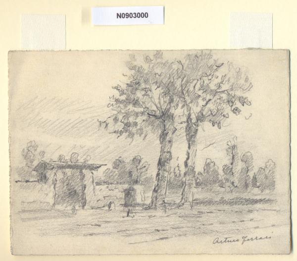 - NOTIZIE STORICO CRITICHE L'artista ha definito il disegno "Al Molinazzo" nella pagina manoscritta che accompagna il nono dei diciotto fascicoli della raccolta denominata "Vecchia Milano". Ugo Nebbia (in "Milano che sfugge", Milano, 1909) descrive il Molinazzo come un aggregato di vecchie abitazioni rurali disposte entro una cinta rettangolare di fabbricati minori e lo colloca fuori Porta Magenta; aggiunge inoltre che il nucleo principale della cascina era contrassegnato dalla presenza di una torre risalente al XIV secolo e dell'antichità del luogo era testimone un piccolo oratorio che si ergeva isolato accanto all'edificio principale. Wolfango Pinardi (in "I Corpi Santi di Porta Vercellina a Milano", Milano, 1966) riporta che fuori Porta Vercellina esisteva la piccola dei chiesa dei santi Filippo e Donato al Molinazzo, l'edificio nel 1950 circa era quasi isolato, c'erano nei pressi solo un vecchio cascinale e campi tagliati da canali d'acqua; il cascinale vicino alla chiesetta era anch'esso chiamato il Molinazzo, poichè in passato aveva un mulino, la cui macina era mossa dalle acque del canale Restocco, poi coperto. Si può ipotizzare che la descrizione offerta dal Pinardi corrisponda al luogo raffigurato dal Ferrari, ma non sono possibili riscontri certi poichè la zona risulta oggi irrimediabilmente trasformata. \nLa vedova di Ferrari, proponendo i disegni all'attenzione del Comune di Milano, riconduceva la loro realizzazione agli ultimi anni di vita del marito. Una delle opere reca la data 1926; inoltre presso il Museo di Milano si conserva un'altra serie di 16 analoghe vedute a matita di Ferrari, datate dal 1924 al 1931. Pertanto si ritiene che la serie del Civico Gabinetto dei Disegni sia stata eseguita nell'arco cronologico dal 1924 al 1932. \nIn quell'epoca Milano stava conoscendo notevoli trasformazioni urbanistiche e il pittore, per contrastare la perdita di memoria provocata dalle demolizioni, decise di fissare nei suoi disegni gli angoli e gli scorci destinati a un radicale cambiamento.