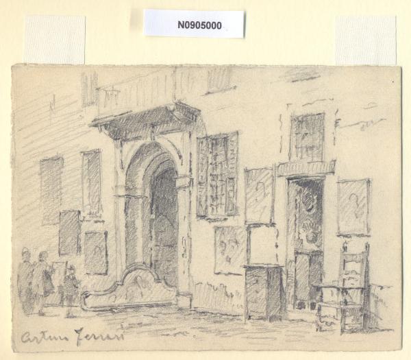 - NOTIZIE STORICO CRITICHE L'artista ha definito il disegno "Il N°12" nella pagina manoscritta che accompagna il nono dei diciotto fascicoli della raccolta denominata "Vecchia Milano". Dall'esame della tipologia architettonica si può supporre che Ferrari abbia raffigurato lo scorcio di un edificio ubicato in centro città. La varietà degli oggetti esposti su strada farebbe pensare all'esercizio di un antiquario o rigattiere. Negli elenchi allegati alla Pianta Topografica di Milano del 1914 edita da Antonio Vallardi, risulta che in via dell'Annunciata 12 e in vicolo San Damiano 12, erano rispettivamente ubicati un antiquario e un rigattiere. Nella Guida di Milano per l'anno 1889, edita dal Bernardoni, è ricordato il celebre antiquario Giuseppe Bertini all'indirizzo di via San Damiano 12. Oggi nelle strade citate non si riconosce l'edificio disegnato da Ferrari.\nDifficile è dunque ricostruire l'ubicazione del luogo raffigurato, ma, considerato il modo confidenziale di identificare la via, nominandola con il solo numero civico, si può ipotizzare che si tratti di una strada strada in prossimità dell'abitazione del pittore (odierna via San Barnaba) oppure supporre un ricordo legato al suo percorso professionale.\nLa vedova di Ferrari, proponendo i disegni all'attenzione del Comune di Milano, riconduceva la loro realizzazione agli ultimi anni di vita del marito. Una delle opere reca la data 1926; inoltre presso il Museo di Milano si conserva un'altra serie di 16 analoghe vedute a matita di Ferrari, datate dal 1924 al 1931. Pertanto si ritiene che la serie del Civico Gabinetto dei Disegni sia stata eseguita nell'arco cronologico dal 1924 al 1932. \nIn quell'epoca Milano stava conoscendo notevoli trasformazioni urbanistiche e il pittore, per contrastare la perdita di memoria provocata dalle demolizioni, decise di fissare nei suoi disegni gli angoli e gli scorci destinati a un radicale cambiamento.