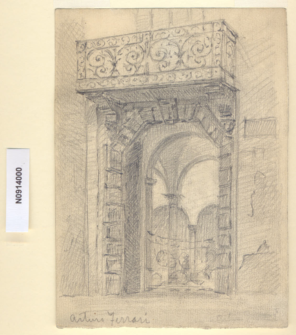 - NOTIZIE STORICO CRITICHE L'artista ha definito il disegno "Casa Bazzaro" nella pagina manoscritta che accompagna il decimo dei diciotto fascicoli della raccolta denominata "Vecchia Milano". Il palazzo era originariamente ubicato in via Gorani 4. L'originaria denominazione del luogo era "Contrada dei Moriggi" finchè nel Seicento vi si stabilì la nobile casata dei Gorani, trasferitasi da Pavia a Milano, e la via prese il nome della nuova famiglia. Nel 1669 Ignazio Gorani acquistò infatti dal conte Pietro Crivelli il palazzo che i suoi discendenti onorarono e abitarono, finchè nel 1769 Ferdinando lo vendette al conte Secco-Comneno, da cui passò per eredità all'Ospedale Maggiore. Fu poi dei Bazzaro-Mattei. Danneggiato dalle incursioni aeree del 1943 il palazzo venne poi abbattuto dalla speculazione edilizia imperversante; il solo portale che ne restava a testimonianza, raffigurato nel disegno in esame, è stato recentemente demolito. \nLa vedova di Ferrari, proponendo i disegni all'attenzione del Comune di Milano, riconduceva la loro realizzazione agli ultimi anni di vita del marito. Una delle opere reca la data 1926; inoltre presso il Museo di Milano si conserva un'altra serie di 16 analoghe vedute a matita di Ferrari, datate dal 1924 al 1931. Pertanto si ritiene che la serie del Civico Gabinetto dei Disegni sia stata eseguita nell'arco cronologico dal 1924 al 1932. \nIn quell'epoca Milano stava conoscendo notevoli trasformazioni urbanistiche e il pittore, per contrastare la perdita di memoria provocata dalle demolizioni, decise di fissare nei suoi disegni gli angoli e gli scorci destinati a un radicale cambiamento.