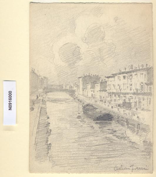 - NOTIZIE STORICO CRITICHE L'artista ha definito il disegno "Naviglio Grande" nella pagina manoscritta che accompagna il decimo dei diciotto fascicoli della raccolta denominata "Vecchia Milano". Dai riscontri in loco si ipotizza che l'attuale ubicazione degli edifici scorciati dal Ferrari corrisponda all'Alzaia del Naviglio Grande approssimativamente al numero civico 66 e che il ponte visibile in lontananza sia quello all'imbocco dell'attuale via Valenza. Ulteriori vedute che inquadrano il medesimo luogo corrispondono ai disegni contrassegnati dai numeri di inventario 898, 939 e 985.\nIn origine il Naviglio Grande, il più esteso canale milanese, era chiamato "Tesinello" poiché riceveva le acque del Ticino nei pressi di Tornavento, e, dopo un percorso di cinquanta chilometri, confluiva in città nella Darsena di Porta Ticinese. Fu scavato alle origini, negli anni tra il 1179 e il 1209, come canale d'irrigazione e in funzione di difesa della città dalle truppe del Barbarossa. Nel 1267 fu chiamato Grande quando la sua sezione fu allargata per renderlo navigabile, assumendo la funzione di importante via commerciale. Tutto il marmo usato per la costruzione del Duomo, dalle cave dell'Ossola, scendendo lungo il fiume Toce, il Lago Maggiore, il Ticino ed il Naviglio Grande, arrivava in città fino al Laghetto di Santo Stefano, vicinissimo al cantiere. La rete fluviale venne completata in seguito con lo scavo di altri canali navigabili, come l'attuale Naviglio Pavese che collega Milano con Pavia e che venne definitivamente inaugurato solo nel 1819. \nI Navigli costituivano la fossa interna che assurgeva al compito di arteria urbana per il traffico natante e cingeva la parte più cospicua della città. Attualmente il termine "Navigli", a Milano, identifica i due tratti scoperti del Naviglio Grande (fra le odierne Ripa di Porta Ticinese e l'Alzaia Naviglio Grande, in direzione di via Lodovico il Moro per Buccinasco e Corsico) e del Naviglio Pavese (fra via Ascanio Sforza e l'Alzaia Naviglio Pavese lungo via Chiesa Rossa per raggiungere Rozzano e collegarsi alla Strada dei Giovi) che si insinuano in città fino all'altezza di piazza XXIV Maggio e in senso più generale l'area compresa fra i due Navigli.\nLa vedova di Ferrari, proponendo i disegni all'attenzione del Comune di Milano, riconduceva la loro realizzazione agli ultimi anni di vita del marito. Una delle opere reca la data 1926; inoltre presso il Museo di Milano si conserva un'altra serie di 16 analoghe vedute a matita di Ferrari, datate dal 1924 al 1931. Pertanto si ritiene che la serie del Civico Gabinetto dei Disegni sia stata eseguita nell'arco cronologico dal 1924 al 1932. \nIn quell'epoca Milano stava conoscendo notevoli trasformazioni urbanistiche e il pittore, per contrastare la perdita di memoria provocata dalle demolizioni, decise di fissare nei suoi disegni gli angoli e gli scorci destinati a un radicale cambiamento.