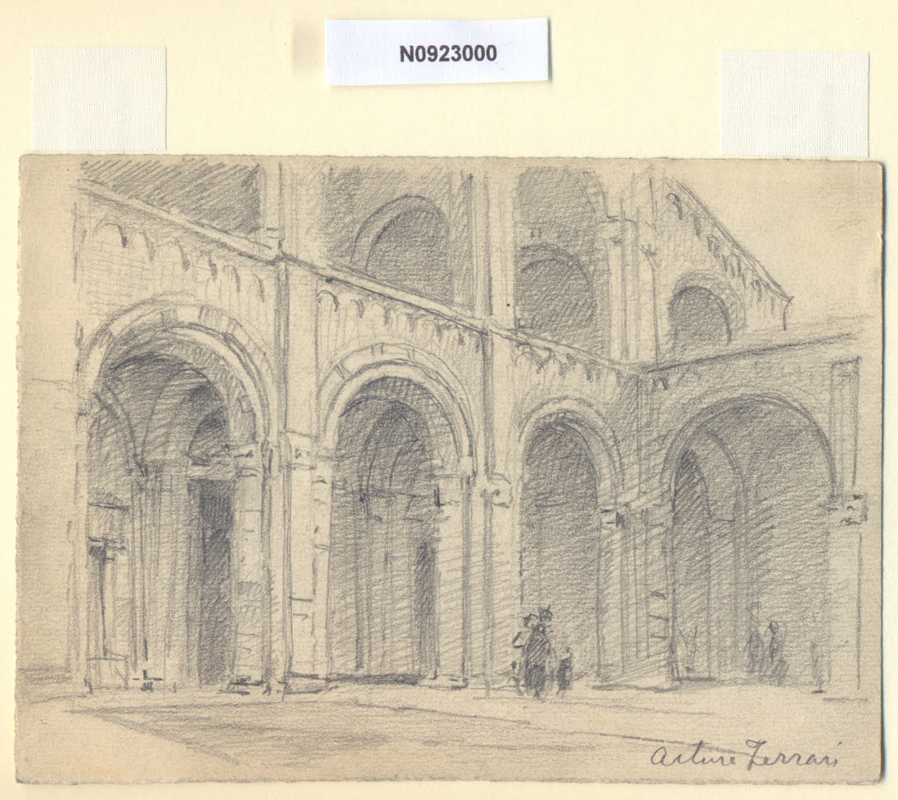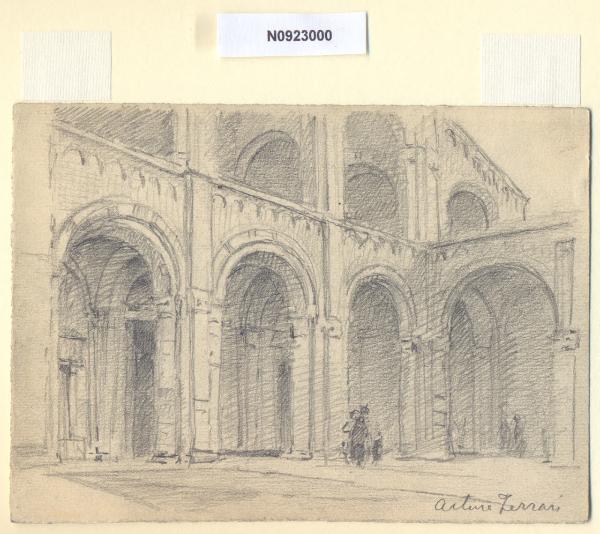 - NOTIZIE STORICO CRITICHE L'artista ha definito il disegno "S Ambrogio" nella pagina manoscritta che accompagna l'undicesimo dei diciotto fascicoli della raccolta denominata "Vecchia Milano". La "Basilica Martirum", consacrata il 19 gennaio del 386 e fondata da Sant'Ambrogio, fu eretta sul luogo di sepoltura dei santi Gervasio e Protasio, nella zona cimiteriale che nel IV secolo accolse le spoglie dei primi martiri della fede. La basilica paleocristiana, con navata centrale doppia rispetto alle laterali, aveva un'unica abside semicircolare. Nell'830 l'edificio fu ampliato per volere dell'arcivescovo Angilberto II e consacrato a Sant'Ambrogio, aggiungendovi l'attuale atrio angolare preposto all'accoglienza di pellegrini e penitenti. Proprio sull'atrio si è soffermata l'attenzione del nostro artista.\nLa vedova di Ferrari, proponendo i disegni all'attenzione del Comune di Milano, riconduceva la loro realizzazione agli ultimi anni di vita del marito. Una delle opere reca la data 1926; inoltre presso il Museo di Milano si conserva un'altra serie di 16 analoghe vedute a matita di Ferrari, datate dal 1924 al 1931. Pertanto si ritiene che la serie del Civico Gabinetto dei Disegni sia stata eseguita nell'arco cronologico dal 1924 al 1932. \nIn quell'epoca Milano stava conoscendo notevoli trasformazioni urbanistiche e il pittore, per contrastare la perdita di memoria provocata dalle demolizioni, decise di fissare nei suoi disegni gli angoli e gli scorci destinati a un radicale cambiamento.
