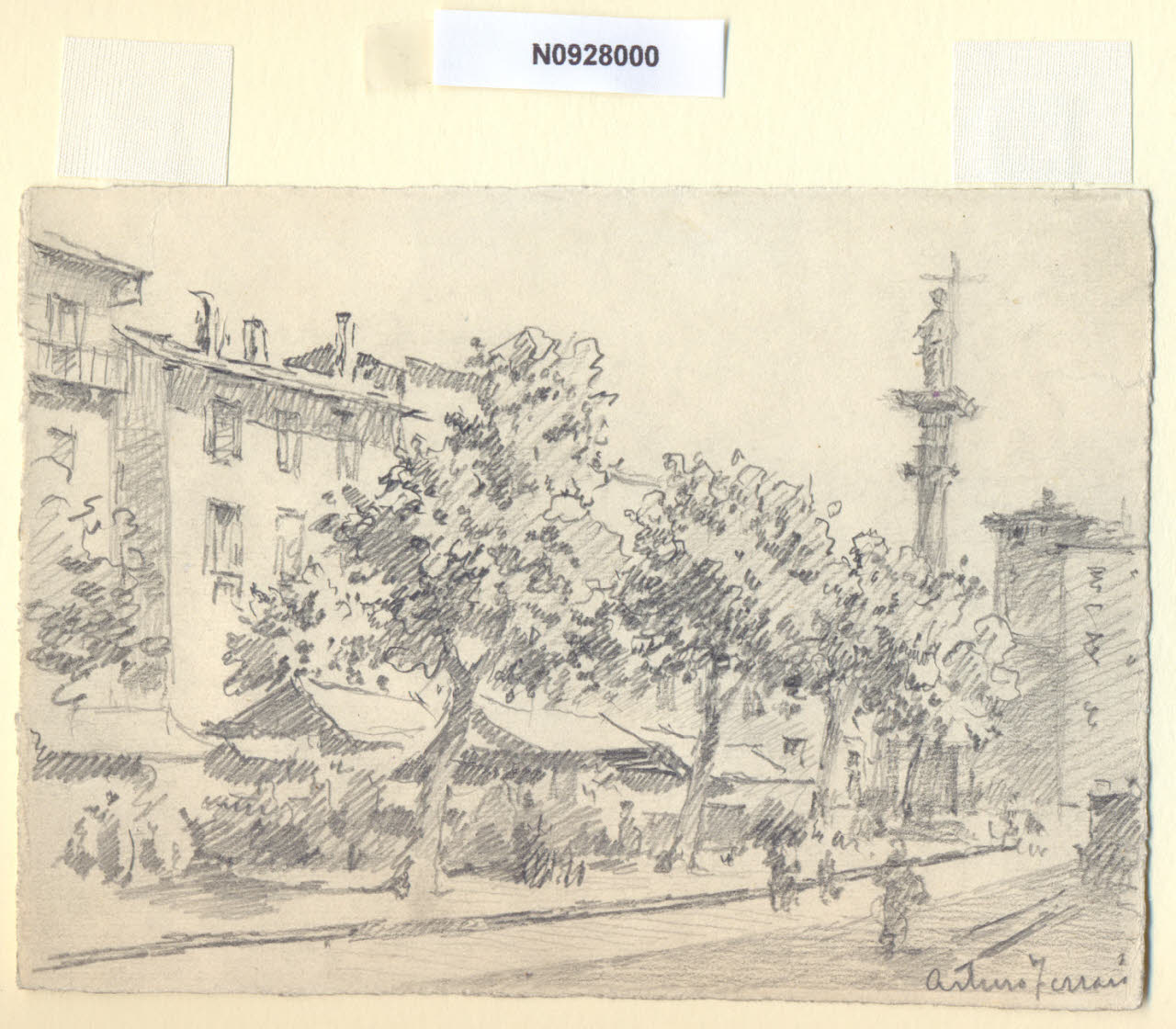 - NOTIZIE STORICO CRITICHE L'artista ha definito il disegno "Verziere" nella pagina manoscritta che accompagna l'undicesimo dei diciotto fascicoli della raccolta denominata "Vecchia Milano". Nel XVI secolo la zona detta del Verziere, oltre ad essere la sede del mercato ortofrutticolo (Verziere deriva da verzura, verdura), trasferito nel 1783 dal ministro Carlo Di Firmian nella vicina piazza Santo Stefano, era uno dei luoghi più malfamati di Milano; da tempo si era diffusa la voce che, oltre ad essere abitazione di molte prostitute, era la zona in cui abitavano le streghe. Nel 1580 la Confraternita della Santa Croce di Porta Tosa cercò un simbolo forte da collocare proprio nel centro del quartiere, la piazza del Verziere; quel simbolo avrebbe dovuto rendere chiaro che quello tornava ad essere territorio protetto dal Signore e che non sarebbero più state ammesse azioni immorali. In onore alla tradizione magica, una colonna fu scelta come simbolo del potere cristiano e sulla cima si scelse di collocare una statua di Cristo Redentore. Un simbolo cristiano di tale potenza avrebbe costretto la comunità dedita alle arti oscure a disperdersi in altre zone della città. \nNel 1583 la costruzione della colonna del Verziere stava per essere ultimata, ma da allora in poi sembrò quasi impossibile portarne a termine la realizzazione. Già nello stesso anno, il 1583, l'autorità municipale intervenne per bloccare i lavori poiché sembrava che non fosse stata richiesta l'autorizzazione ad occupare lo spazio pubblico; i soldati demolirono parte della colonna, mentre i lavoranti furono arrestati e incarcerati sotto pesanti accuse. Solo nel 1604 le autorità e la Confraternita appianarono le loro divergenze: tutti i permessi furono concessi. I lavori ripresero a ritmo elevato per essere interrotti quasi subito. Non si ha notizia dei nuovi problemi burocratici che si abbatterono sulla colonna; per certo si può affermare che i lavori furono ultimati solo nel 1611. Mancava, però, ancora la statua del Redentore sulla cima della colonna. Altre lungaggini burocratiche impedirono alla Confraternita di innalzare il simbolo cristiano per altri cinquant'anni. Solo nel 1673 la statua di Cristo, che ancora oggi vediamo, realizzata dai Vismara su disegno di Francesco Maria Richini, trovò collocazione sulla cima della colonna di piazza del Verziere. Nel 1784, per volere di Giuseppe II Imperatore d'Austria, molte delle colonne votive che punteggiavano la città furono demolite. Quella del Verziere fu una delle poche a salvarsi. Più tardi, nel 1858, venne completamente smontata perché pericolante. Fu rimontata due anni più tardi, per diventare il primo monumento alle Cinque Giornate di Milano, con il nome di Colonna della Vittoria. Ancora oggi si possono leggere i nomi di 354 cittadini caduti per la libertà sulle targhe di bronzo che si trovano sul basamento.\nMercati comunali a modeste dimensioni come quello del Verziere, venivano riorganizzati secondo nuovi modelli gestionali dove contavano le ragioni d'igiene, della valorizzazione delle aree centrali, del decoro. Nel 1911 l'ufficio tecnico comunale redasse il progetto di un unico grande mercato lungo corso XXII marzo, zona ad alta accessibilità prospiciente il nuovo scalo merci di Porta Vittoria. \nLa vedova di Ferrari, proponendo i disegni all'attenzione del Comune di Milano, riconduceva la loro realizzazione agli ultimi anni di vita del marito. Una delle opere reca la data 1926; inoltre presso il Museo di Milano si conserva un'altra serie di 16 analoghe vedute a matita di Ferrari, datate dal 1924 al 1931. Pertanto si ritiene che la serie del Civico Gabinetto dei Disegni sia stata eseguita nell'arco cronologico dal 1924 al 1932. \nIn quell'epoca Milano stava conoscendo notevoli trasformazioni urbanistiche e il pittore, per contrastare la perdita di memoria provocata dalle demolizioni, decise di fissare nei suoi disegni gli angoli e gli scorci destinati a un radicale cambiamento.