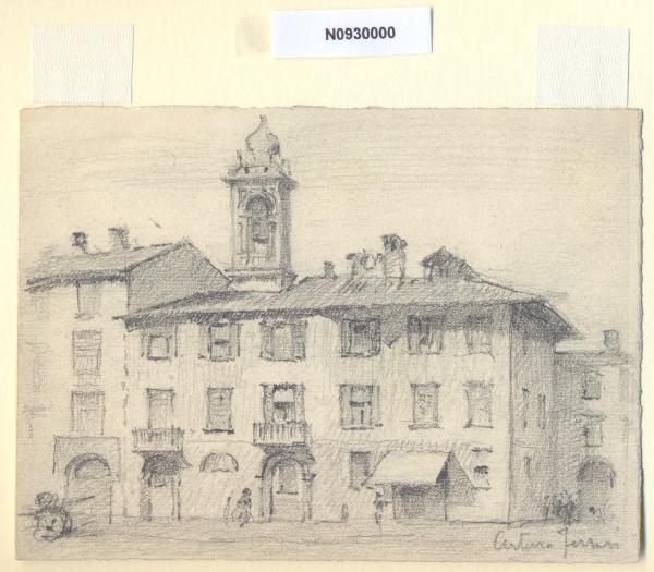 - NOTIZIE STORICO CRITICHE L'artista ha definito il disegno "Via Laghetto" nella pagina manoscritta che accompagna il dodicesimo dei diciotto fascicoli della raccolta denominata "Vecchia Milano". L'attuale denominazione del luogo è via Laghetto. Il Laghetto, che fungeva da collegamento tra la contrada dell'Ospedale e via Francesco Sforza, venne aperto nel 1388 per concessione di Gian Galeazzo Visconti, a spese della Fabbrica del Duomo. Era infatti il luogo dove in origine le acque della fossa interna si raccoglievano a formare una piccola darsena, allo scopo di agevolare l'attracco dei barconi e lo scarico dei blocchi provenienti dalle cave di Candoglia, destinati alla Fabbrica del Duomo, oltre al materiale per la fabbrica dell'Ospedale: granito, marmo rosso di Baveno. Vi scaricavano anche le barche provenienti dal Lago Maggiore con carichi di carbone; gli uomini addetti a tale lavoro abitavano nelle case limitrofe una delle quali detta "ca' dei tencitt" poichè mostravano spesso gli abiti e i volti anneriti dalla polvere. La navigazione nella cerchia interna era resa complicata dai dislivelli tra la Darsena e il Laghetto, il problema fu risolto col geniale meccanismo di chiuse, installato nel 1439 dagli ingegneri idraulici Fioravante da Bologna e Filippo da Modena detto degli Organi, che intervennero anche nel superare la differenza di livello delle acque di quasi due metri tra il Ticino e il Naviglio di Gaggiano. La zona appare oggi del tutto diversa e le principali trasformazioni risalgono al 1857 quando il Laghetto venne interrato per ordine dell'imperatore d'Austria Francesco Giuseppe, per motivi di igiene pubblica, poiché le esalazioni dell'acqua e le zanzare molestavano i malati del vicino Ospedale Maggiore. \nNella veduta viene inquadrato anche il campanile della basilica di Santo Stefano Maggiore.\nLa vedova di Ferrari, proponendo i disegni all'attenzione del Comune di Milano, riconduceva la loro realizzazione agli ultimi anni di vita del marito. Una delle opere reca la data 1926; inoltre presso il Museo di Milano si conserva un'altra serie di 16 analoghe vedute a matita di Ferrari, datate dal 1924 al 1931. Pertanto si ritiene che la serie del Civico Gabinetto dei Disegni sia stata eseguita nell'arco cronologico dal 1924 al 1932. \nIn quell'epoca Milano stava conoscendo notevoli trasformazioni urbanistiche e il pittore, per contrastare la perdita di memoria provocata dalle demolizioni, decise di fissare nei suoi disegni gli angoli e gli scorci destinati a un radicale cambiamento.