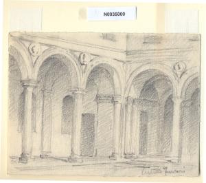 - NOTIZIE STORICO CRITICHE L'artista ha definito il disegno "Casa Litta Modignani" nella pagina manoscritta che accompagna il dodicesimo dei diciotto fascicoli della raccolta denominata "Vecchia Milano". L'attuale ubicazione del palazzo è corso Europa 16. Il cortile con portici su colonne toscane di granito, con archi e ghiere di cotto, presenta nei pennacchi medaglioni di terracotta con profili dei duchi di Milano, alcuni del Settecento, altri aggiunti in un restauro Ottocentesco. Una cornice di cotto separa il pianterreno dal primo piano sul quale si aprono le finestre moderne. Il portico della parete di fondo sfocia in un vasto andito a criptoportico retto da doppie colonne con archi ribassati che a sua volta immette in un secondo cortile; i due cortili allineati creano così un inconsueto effetto scenografico.\nLa vedova di Ferrari, proponendo i disegni all'attenzione del Comune di Milano, riconduceva la loro realizzazione agli ultimi anni di vita del marito. Una delle opere reca la data 1926; inoltre presso il Museo di Milano si conserva un'altra serie di 16 analoghe vedute a matita di Ferrari, datate dal 1924 al 1931. Pertanto si ritiene che la serie del Civico Gabinetto dei Disegni sia stata eseguita nell'arco cronologico dal 1924 al 1932. \nIn quell'epoca Milano stava conoscendo notevoli trasformazioni urbanistiche e il pittore, per contrastare la perdita di memoria provocata dalle demolizioni, decise di fissare nei suoi disegni gli angoli e gli scorci destinati a un radicale cambiamento.