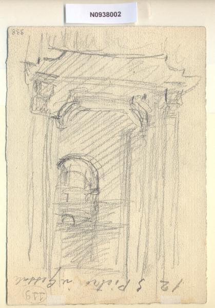 - NOTIZIE STORICO CRITICHE E' ipotizzabile che il portale raffigurato corrisponda a quello del disegno di Palazzo Fagnani, contrassegnato dal numero di inventario 882 recto, allora ubicato in via Santa Maria Fulcorina 20, che con le vie del Bocchetto, del Bollo, Santa Marta e Santa Maria Podone forma un crocicchio detto "Le Cinque Vie", luogo molto antico, probabilmente adibito al traffico commerciale, la cui origine si fa risalire all'età imperiale, ma del quale resta solo la planimetria. L'unico palazzo ancora esistente a Milano appartenuto ai Fagnani oggi è di proprietà dei conti Ronzoni, lo si identifica per lo stile barocchetto lombardo e perché è adiacente a un ex oratorio, San Matteo alla Banchetta, un tempo chiesa di famiglia, fondato nel 1065 dal nobile cittadino Angilberto da Fagnano. E' ipotizzabile che l'appellativo "banchetta" ricordi che i Fagnani furono in origine una famiglia di banchieri e gabellieri di banco (dazieri).\nL'iscrizione "S. Pietro in Gessate" si riferisce alla veduta sul recto del foglio.