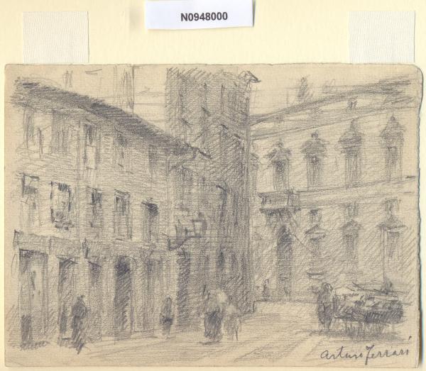 - NOTIZIE STORICO CRITICHE L'artista ha definito il disegno "Via Lanzone" nella pagina manoscritta che accompagna il tredicesimo dei diciotto fascicoli della raccolta denominata "Vecchia Milano". La via trae nome da Lanzone da Corte, nobile milanese eletto nel 1042 capitano del popolo in lotta contro la nobiltà, che voleva infeudare la città. In seguito ad un tumulto riuscì a scacciare i nobili da Milano, ma i nobili a loro volta cinsero d'assedio la città. Dopo quasi tre anni di lotte, Lanzone si recò in Germania a sollecitare l'aiuto dell'imperatore Enrico III, ma deluso dalle durissime condizione imposte dal sovrano, persuase i nobili a desistere dalla lotta e conciliarsi col popolo.\nLa vedova di Ferrari, proponendo i disegni all'attenzione del Comune di Milano, riconduceva la loro realizzazione agli ultimi anni di vita del marito. Una delle opere reca la data 1926; inoltre presso il Museo di Milano si conserva un'altra serie di 16 analoghe vedute a matita di Ferrari, datate dal 1924 al 1931. Pertanto si ritiene che la serie del Civico Gabinetto dei Disegni sia stata eseguita nell'arco cronologico dal 1924 al 1932. \nIn quell'epoca Milano stava conoscendo notevoli trasformazioni urbanistiche e il pittore, per contrastare la perdita di memoria provocata dalle demolizioni, decise di fissare nei suoi disegni gli angoli e gli scorci destinati a un radicale cambiamento.