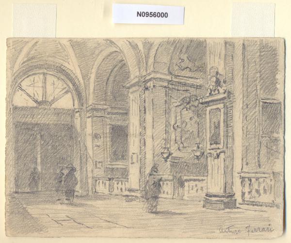 - NOTIZIE STORICO CRITICHE L'artista ha definito il disegno "La Passione" nella pagina manoscritta che accompagna il quattordicesimo dei diciotto fascicoli della raccolta denominata "Vecchia Milano". La chiesa, attualmente ubicata in via Vincenzo Bellini, ha origine nel XV secolo quando Birago, arcivescovo di Metellino, donò a Milano il terreno per l'edificazione. La prima parte ad essere costruita fu quella terminale, costituita da un tiburio ottagonale cui erano collegate otto cappelle, alternativamente a pianta semicircolare o rettangolare (1486). Il primitivo impianto forse concepito da Giovanni Antonio Amadeo, ma realizzato da Giovanni Battagio, era quindi centralizzato, come in molti santuari mariani della Lombardia rinascimentale. Di seguito il Lombardino edificò il tiburio, con le sue consuete e sobrie linee classicistiche. Ideata da Cristoforo Solari o, secondo Baroni, da Cristoforo Lombardi detto il Lombardino, fu compiuta nel 1530. Inizialmente costruito a croce greca, nel 1573, su istanza di Carlo Borromeo, l'edificio fu trasformato in un impianto longitudinale, più adatto alla predicazione, con l'aggiunta delle navate laterali ad opera dell'architetto Martino Bassi. \nNel disegno in esame Ferrari si sofferma sulla definizione della prima e della seconda cappella laterale nella navata sinistra, inondate dalla luce proveniente dalla finestra soprastante l'ingresso laterale alla chiesa. \nLa vedova di Ferrari, proponendo i disegni all'attenzione del Comune di Milano, riconduceva la loro realizzazione agli ultimi anni di vita del marito. Una delle opere reca la data 1926; inoltre presso il Museo di Milano si conserva un'altra serie di 16 analoghe vedute a matita di Ferrari, datate dal 1924 al 1931. Pertanto si ritiene che la serie del Civico Gabinetto dei Disegni sia stata eseguita nell'arco cronologico dal 1924 al 1932.