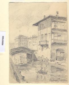 - NOTIZIE STORICO CRITICHE L'artista ha definito il disegno "Ponte dei Medici" nella pagina manoscritta che accompagna il quattordicesimo dei diciotto fascicoli della raccolta denominata "Vecchia Milano". Lo stesso ponte si riscontra in un altro disegno del Ferrari, contrassegnato dal numero di inventario 845 e intitolato "A via Montebello", perchè il ponte era collocato proprio tra via Montebello e via San Marco.\nIn origine i Navigli costituivano la fossa interna che assurgeva al compito di arteria urbana per il traffico natante e cingeva la parte più cospicua della città. La zona appare oggi del tutto diversa e le principali trasformazioni risalgono alla seconda metà del XIX secolo, quando, in seguito all'introduzione dei tram, si iniziò a ipotizzare la copertura dei tratti cittadini dei Navigli. Nel 1891 il primo segmento della fossa interna ad essere sacrificato fu quello occidentale, il cosiddetto Naviglio di San Gerolamo; a partire dal 1929 i lavori di copertura ripresero con sistematicità ininterrotta fino al 1930/1931. Attualmente il termine "Navigli", a Milano, identifica i due tratti scoperti del Naviglio Grande (fra le odierne Ripa di Porta Ticinese e l'Alzaia Naviglio Grande, in direzione di via Lodovico il Moro per Buccinasco e Corsico) e del Naviglio Pavese (fra via Ascanio Sforza e l'Alzaia Naviglio Pavese lungo via Chiesa Rossa per raggiungere Rozzano e collegarsi alla Strada dei Giovi) che si insinuano in città fino all'altezza di piazza XXIV Maggio e in senso più generale l'area compresa fra i due Navigli.\nLa vedova di Ferrari, proponendo i disegni all'attenzione del Comune di Milano, riconduceva la loro realizzazione agli ultimi anni di vita del marito. Una delle opere reca la data 1926; inoltre presso il Museo di Milano si conserva un'altra serie di 16 analoghe vedute a matita di Ferrari, datate dal 1924 al 1931. Pertanto si ritiene che la serie del Civico Gabinetto dei Disegni sia stata eseguita nell'arco cronologico dal 1924 al 1932. \nIn quell'epoca Milano stava conoscendo notevoli trasformazioni urbanistiche e il pittore, per contrastare la perdita di memoria provocata dalle demolizioni, decise di fissare nei suoi disegni gli angoli e gli scorci destinati a un radicale cambiamento.