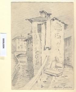 - NOTIZIE STORICO CRITICHE L'artista ha definito il disegno "Via Vallone" nella pagina manoscritta che accompagna il sedicesimo dei diciotto fascicoli della raccolta denominata "Vecchia Milano". L'edificio più alto (vestigia di una torre) è probabilmente un residuo di quel recinto chiamato Cittadella, fatto edificare da Azzone Visconti (1330-39) per racchiudere il borgo di Sant'Eustorgio. Tale recinzione aveva origine accanto alla Pusterla dei Fabbri, seguiva il Naviglio di via Vallone, ripiegava lungo il Ticinello, risaliva lungo via Santa Croce e si univa alle mura in corrispondenza di via Chiusa. Il nome stesso di via Vallone ricorda il muro ("vallum") o bastione difensivo di questa nuova cerchia supplementare. Via Vallone è attualmente denominata via Conca del Naviglio. \nIn origine i Navigli costituivano la fossa interna che assurgeva al compito di arteria urbana per il traffico natante e cingeva la parte più cospicua della città. La zona appare oggi del tutto diversa e le principali trasformazioni risalgono alla seconda metà del XIX secolo, quando, in seguito all'introduzione dei tram, si iniziò a ipotizzare la copertura dei tratti cittadini dei Navigli. Nel 1891 il primo segmento della fossa interna ad essere sacrificato fu quello occidentale, il cosiddetto Naviglio di San Gerolamo; a partire dal 1929 i lavori di copertura ripresero con sistematicità ininterrotta fino al 1930/1931. Attualmente il termine "Navigli", a Milano, identifica i due tratti scoperti del Naviglio Grande (fra le odierne Ripa di Porta Ticinese e l'Alzaia Naviglio Grande, in direzione di via Lodovico il Moro per Buccinasco e Corsico) e del Naviglio Pavese (fra via Ascanio Sforza e l'Alzaia Naviglio Pavese lungo via Chiesa Rossa per raggiungere Rozzano e collegarsi alla Strada dei Giovi) che si insinuano in città fino all'altezza di piazza XXIV Maggio e in senso più generale l'area compresa fra i due Navigli.\nLa vedova di Ferrari, proponendo i disegni all'attenzione del Comune di Milano, riconduceva la loro realizzazione agli ultimi anni di vita del marito. Una delle opere reca la data 1926; inoltre presso il Museo di Milano si conserva un'altra serie di 16 analoghe vedute a matita di Ferrari, datate dal 1924 al 1931. Pertanto si ritiene che la serie del Civico Gabinetto dei Disegni sia stata eseguita nell'arco cronologico dal 1924 al 1932. \nIn quell'epoca Milano stava conoscendo notevoli trasformazioni urbanistiche e il pittore, per contrastare la perdita di memoria provocata dalle demolizioni, decise di fissare nei suoi disegni gli angoli e gli scorci destinati a un radicale cambiamento.