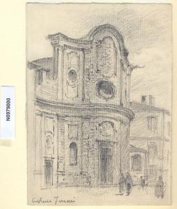 - NOTIZIE STORICO CRITICHE L'artista ha definito il disegno "I Crociferi" nella pagina manoscritta che accompagna il sedicesimo dei diciotto fascicoli della raccolta denominata "Vecchia Milano". L'attuale ubicazione della chiesa raffigurata è via Durini, strada dal tracciato molto antico poichè lungo di essa si estendevano le mura romane di Massimiano. L'originaria denominazione del sito era "Cantarana di Porta Tosa" per un corso d'acqua che lo costeggiava, probabilmente contraddistinto dal gracidio delle rane. Quando Giambattista Durini fece edificare il palazzo di famiglia dall'architetto Francesco Maria Richini, alla strada fu dato un tono più elegante e rappresentò l'inizio del rinnovamento di tutta la zona. \nLa chiesa, denominata Santa Maria della Sanità o dei Crociferi, era stata affidata alla Congregazione dei Ministri degli Infermi (detti anche "Incroxiati", per la croce di panno rossa applicata sulla veste nera) che si era trasferita nella contrada nel 1632. La chiesa fu edificata nel 1709 su progetto attribuito a Carlo Federico Pietrasanta, allievo dell'ingegnere milanese Giovan Battista Quadrio. La facciata di nudo ammattonato, panciuta al centro e concava alle ali, termina con un frontone ricurvo. Nel 1787 la chiesa divenne parrocchia e tale rimase fino al 1805, quando divenne sussidiaria di Santo Stefano.\nLa vedova di Ferrari, proponendo i disegni all'attenzione del Comune di Milano, riconduceva la loro realizzazione agli ultimi anni di vita del marito. Una delle opere reca la data 1926; inoltre presso il Museo di Milano si conserva un'altra serie di 16 analoghe vedute a matita di Ferrari, datate dal 1924 al 1931. Pertanto si ritiene che la serie del Civico Gabinetto dei Disegni sia stata eseguita nell'arco cronologico dal 1924 al 1932. \nIn quell'epoca Milano stava conoscendo notevoli trasformazioni urbanistiche e il pittore, per contrastare la perdita di memoria provocata dalle demolizioni, decise di fissare nei suoi disegni gli angoli e gli scorci destinati a un radicale cambiamento.