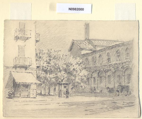- NOTIZIE STORICO CRITICHE L'artista ha definito il disegno "Da Via Osti" nella pagina manoscritta che accompagna il diciassettesimo dei diciotto fascicoli della raccolta denominata "Vecchia Milano". L'attuale denominazione della via si deve alla presenza di alcune osterie; nel Seicento infatti la zona di Porta Romana poteva vantare il maggior numero di osterie di Milano, circa diciotto, poichè si trovava sulla via di accesso più importante della città. Un tempo la contrada finiva nella piazzetta di Sant'Ulderico, oggi scomparsa e inglobata in largo Richini; nella veduta di Ferrari viene infatti inquadrata anche la loggia dell'Ospedale Maggiore, oggi sede dell'Università degli Studi. \nLa vedova di Ferrari, proponendo i disegni all'attenzione del Comune di Milano, riconduceva la loro realizzazione agli ultimi anni di vita del marito. Una delle opere reca la data 1926; inoltre presso il Museo di Milano si conserva un'altra serie di 16 analoghe vedute a matita di Ferrari, datate dal 1924 al 1931. Pertanto si ritiene che la serie del Civico Gabinetto dei Disegni sia stata eseguita nell'arco cronologico dal 1924 al 1932. \nIn quell'epoca Milano stava conoscendo notevoli trasformazioni urbanistiche e il pittore, per contrastare la perdita di memoria provocata dalle demolizioni, decise di fissare nei suoi disegni gli angoli e gli scorci destinati a un radicale cambiamento.