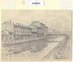 - NOTIZIE STORICO CRITICHE L'artista ha definito il disegno "Naviglio Grande" nella pagina manoscritta che accompagna il diciassettesimo dei diciotto fascicoli della raccolta denominata "Vecchia Milano". Dai riscontri in loco si ipotizza che l'attuale ubicazione degli edifici scorciati dal Ferrari corrisponda all'Alzaia del Naviglio Grande approssimativamente al numero civico 66 e che il ponte visibile in lontananza sia quello che conduce all'imbocco dell'attuale via Casale. Ulteriori vedute che inquadrano il medesimo luogo sono contrassegnate da numeri di inventario 898, 916 e 939.\nIn origine il Naviglio Grande, il più esteso canale milanese, era chiamato "Tesinello" poiché riceveva le acque del Ticino nei pressi di Tornavento, e, dopo un percorso di cinquanta chilometri, confluiva in città nella Darsena di Porta Ticinese. Fu scavato alle origini, negli anni tra il 1179 e il 1209, come canale d'irrigazione e in funzione di difesa della città dalle truppe del Barbarossa. Nel 1267 fu chiamato Grande quando la sua sezione fu allargata per renderlo navigabile, assumendo la funzione di importante via commerciale. Tutto il marmo usato per la costruzione del Duomo, dalle cave dell'Ossola, scendendo lungo il fiume Toce, il Lago Maggiore, il Ticino ed il Naviglio Grande, arrivava in città fino al Laghetto di Santo Stefano, vicinissimo al cantiere. La rete fluviale venne completata in seguito con lo scavo di altri canali navigabili, come l'attuale Naviglio Pavese che collega Milano con Pavia; il suo impiego è assai più tardo, in quanto fu definitivamente inaugurato solo nel 1819. \nI Navigli costituivano la fossa interna che assurgeva al compito di arteria urbana per il traffico natante e cingeva la parte più cospicua della città. Attualmente il termine "Navigli", a Milano, identifica i due tratti scoperti del Naviglio Grande (fra le odierne Ripa di Porta Ticinese e l'Alzaia Naviglio Grande, in direzione di via Lodovico il Moro per Buccinasco e Corsico) e del Naviglio Pavese (fra via Ascanio Sforza e l'Alzaia Naviglio Pavese lungo via Chiesa Rossa per raggiungere Rozzano e collegarsi alla Strada dei Giovi) che si insinuano in città fino all'altezza di piazza XXIV Maggio e in senso più generale l'area compresa fra i due Navigli.\nLa vedova di Ferrari, proponendo i disegni all'attenzione del Comune di Milano, riconduceva la loro realizzazione agli ultimi anni di vita del marito. Una delle opere reca la data 1926; inoltre presso il Museo di Milano si conserva un'altra serie di 16 analoghe vedute a matita di Ferrari, datate dal 1924 al 1931. Pertanto si ritiene che la serie del Civico Gabinetto dei Disegni sia stata eseguita nell'arco cronologico dal 1924 al 1932. \nIn quell'epoca Milano stava conoscendo notevoli trasformazioni urbanistiche e il pittore, per contrastare la perdita di memoria provocata dalle demolizioni, decise di fissare nei suoi disegni gli angoli e gli scorci destinati a un radicale cambiamento.