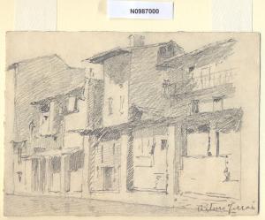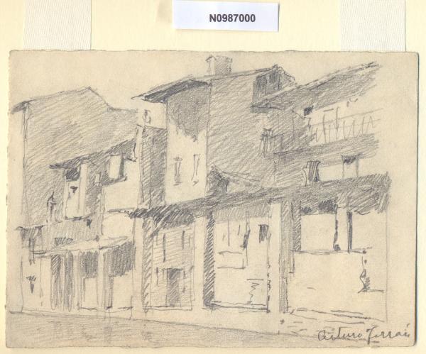 - NOTIZIE STORICO CRITICHE L'artista ha definito il disegno "Dal P di P. Ticinese" nella pagina manoscritta che accompagna il diciassettesimo dei diciotto fascicoli della raccolta denominata "Vecchia Milano". Dai riscontri in loco si ipotizza che l'attuale ubicazione degli edifici scorciati dal Ferrari corrisponda all'incrocio tra le odierne via Edmondo De Amicis e corso di Porta Ticinese, per la vicinanza delle case all'acqua del Naviglio della fossa interna. Anticamente via De Amicis ebbe il nome di via Vittoria, quando chiesa e monastero assunsero il nome di Santa Maria della Vittoria. La via comprendeva il tratto che andava dal ponte di San Vittore e, attraverso quello di via Olocati, giungeva al ponte di Porta Ticinese, protetto dal fortilizio visconteo della Pusterla. \nSi tratta soltanto di supposizioni poichè la zona appare oggi del tutto diversa e le principali trasformazioni risalgono alla seconda metà del XIX secolo, quando, in seguito all'introduzione dei tram, si iniziò a progettare la copertura dei tratti cittadini dei Navigli. Nel 1891 il primo segmento della fossa interna ad essere sacrificato fu quello occidentale, il cosiddetto Naviglio di San Gerolamo; a partire dal 1929 i lavori di copertura ripresero con sistematicità ininterrotta fino al 1930/1931. Attualmente il termine "Navigli", a Milano, identifica i due tratti scoperti del Naviglio Grande (fra le odierne Ripa di Porta Ticinese e l'Alzaia Naviglio Grande, in direzione di via Lodovico il Moro per Buccinasco e Corsico) e del Naviglio Pavese (fra via Ascanio Sforza e l'Alzaia Naviglio Pavese lungo via Chiesa Rossa per raggiungere Rozzano e collegarsi alla Strada dei Giovi) che si insinuano in città fino all'altezza di piazza XXIV Maggio e in senso più generale l'area compresa fra i due Navigli.\nLa vedova di Ferrari, proponendo i disegni all'attenzione del Comune di Milano, riconduceva la loro realizzazione agli ultimi anni di vita del marito. Una delle opere reca la data 1926; inoltre presso il Museo di Milano si conserva un'altra serie di 16 analoghe vedute a matita di Ferrari, datate dal 1924 al 1931. Pertanto si ritiene che la serie del Civico Gabinetto dei Disegni sia stata eseguita nell'arco cronologico dal 1924 al 1932. \nIn quell'epoca Milano stava conoscendo notevoli trasformazioni urbanistiche e il pittore, per contrastare la perdita di memoria provocata dalle demolizioni, decise di fissare nei suoi disegni gli angoli e gli scorci destinati a un radicale cambiamento.