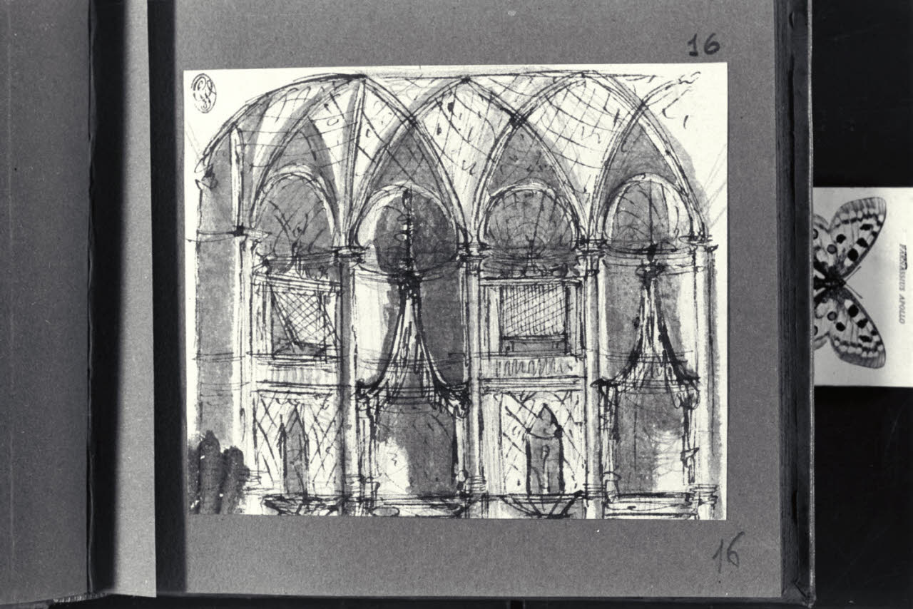 - NOTIZIE STORICO CRITICHE Il disegno fa parte di un piccolo album Vallardi del 1840, di dimensioni mm 160 x 175, sulla cui copertina in pelle marrone chiaro è incisa l'iscrizione in lettere capitali dorate "Paolo Landriani / milanese / e suoi contemporanei / nell'arte prospettica valentissimi / questi loro disegni / Giuseppe Vallardi / raccolse per tramandare / co' passati maestri a' futuri / la stabile rinomanza / della scuola lombarda / l'anno MDCCCXL". Ogni singolo disegno è incollato a un foglio dell'album di carta di colore grigio-azzurro.