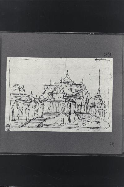 - NOTIZIE STORICO CRITICHE Il disegno fa parte di un piccolo album Vallardi del 1840, di dimensioni mm 160 x 175, sulla cui copertina in pelle marrone chiaro è incisa l'iscrizione in lettere capitali dorate "Paolo Landriani / milanese / e suoi contemporanei / nell'arte prospettica valentissimi / questi loro disegni / Giuseppe Vallardi / raccolse per tramandare / co' passati maestri a' futuri / la stabile rinomanza / della scuola lombarda / l'anno MDCCCXL". Ogni singolo disegno è incollato a un foglio dell'album di carta di colore grigio-azzurro.