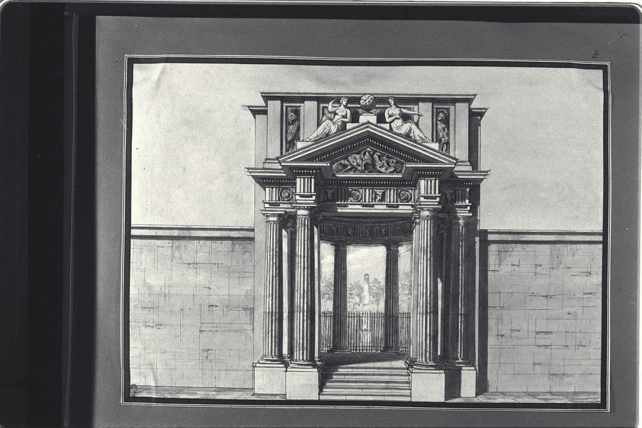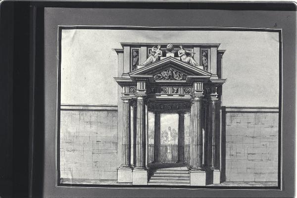 - NOTIZIE STORICO CRITICHE Il disegno fa parte di un album Vallardi del 1840, di dimensioni mm 352 x 460, sulla cui copertina in pelle marrone chiaro è incisa l'iscrizione in lettere capitali dorate "Paolo Landriani / milanese / e suoi contemporanei / nell'arte prospettica valentissimi / questi loro disegni / Giuseppe Vallardi / raccolse / per tramandare / co' passati maestri a' futuri / la stabile rinomanza / della scuola lombarda / l'anno MDCCCXL". Ogni singolo disegno è incollato a un foglio dell'album di carta di colore grigio-azzurro.\nStando a quanto riportato Amalia Pacia nel catalogo della sua mostra del 1977, il disegno sarebbe uno studio del Landriani per il frontespizio di uno dei suoi scritti. Effettivamente, sono riscontrabili analogie iconografiche con altri frontespizi conservati nello stesso album Vallardi D 13.