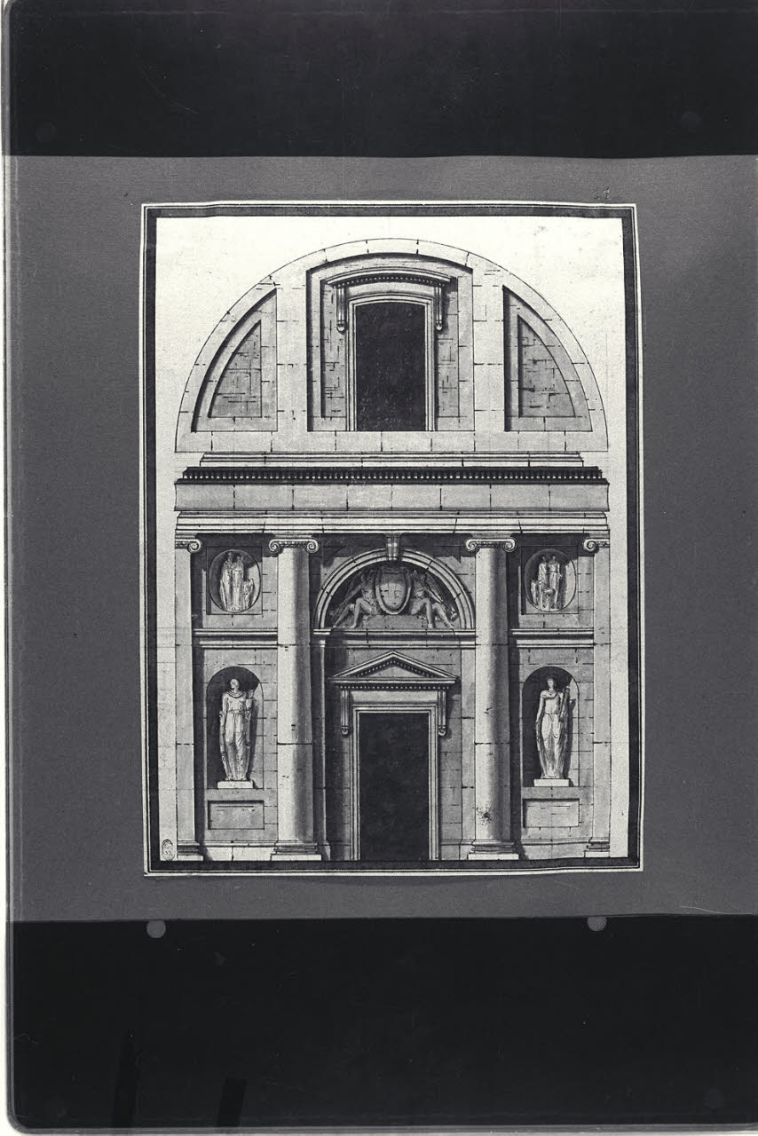 - NOTIZIE STORICO CRITICHE Il disegno fa parte di un album Vallardi del 1840, di dimensioni mm 352 x 460, sulla cui copertina in pelle marrone chiaro è incisa l'iscrizione in lettere capitali dorate "Paolo Landriani / milanese / e suoi contemporanei / nell'arte prospettica valentissimi / questi loro disegni / Giuseppe Vallardi / raccolse / per tramandare / co' passati maestri a' futuri / la stabile rinomanza / della scuola lombarda / l'anno MDCCCXL". Ogni singolo disegno è incollato a un foglio dell'album di carta di colore grigio-azzurro.\nL'opera presenta similitudini stilistiche con altre, di analogo soggetto, attribuite a Paolo Landriani e conservate negli album Vallardi.