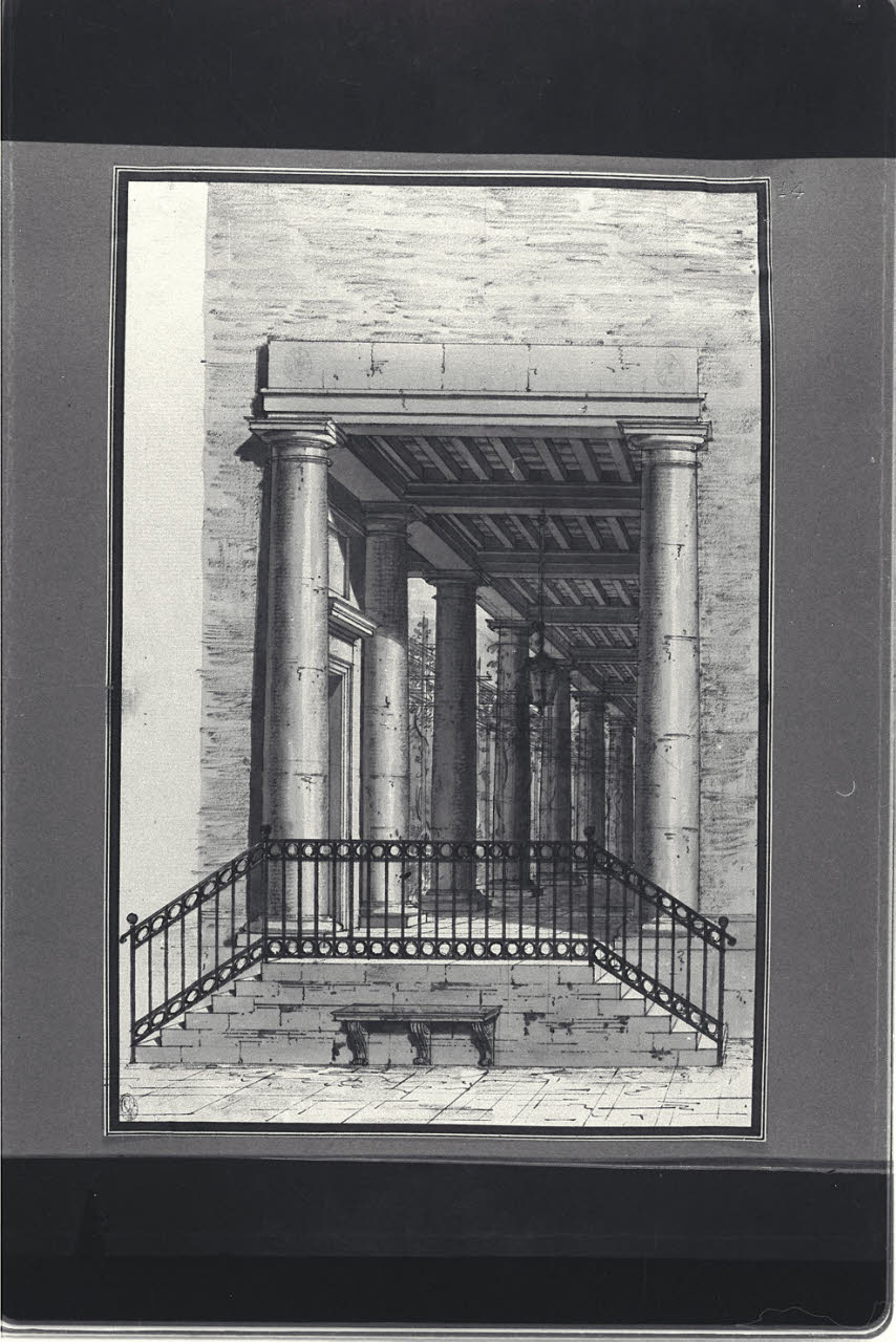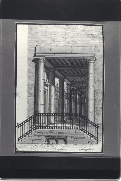 - NOTIZIE STORICO CRITICHE Il disegno fa parte di un album Vallardi del 1840, di dimensioni mm 352 x 460, sulla cui copertina in pelle marrone chiaro è incisa l'iscrizione in lettere capitali dorate "Paolo Landriani / milanese / e suoi contemporanei / nell'arte prospettica valentissimi / questi loro disegni / Giuseppe Vallardi / raccolse / per tramandare / co' passati maestri a' futuri / la stabile rinomanza / della scuola lombarda / l'anno MDCCCXL". Ogni singolo disegno è incollato a un foglio dell'album di carta di colore grigio-azzurro.\nL'opera presenta similitudini iconografiche e stilistiche con un altro disegno architettonico attribuito a Landriani (INVN 1083 L D,8), anch'esso conservato nell'album Vallardi D 13.