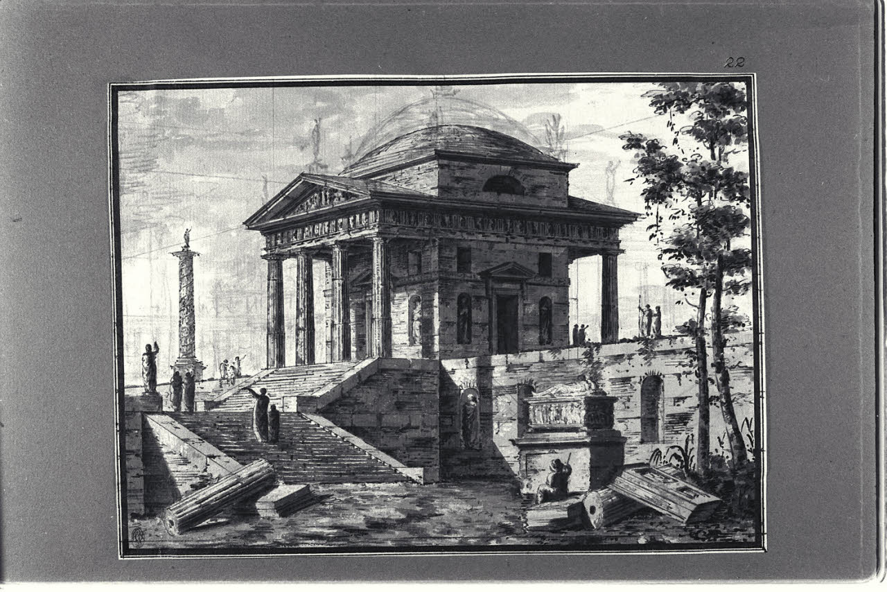 - NOTIZIE STORICO CRITICHE Il disegno fa parte di un album Vallardi del 1840, di dimensioni mm 352 x 460, sulla cui copertina in pelle marrone chiaro è incisa l'iscrizione in lettere capitali dorate "Paolo Landriani / milanese / e suoi contemporanei / nell'arte prospettica valentissimi / questi loro disegni / Giuseppe Vallardi / raccolse / per tramandare / co' passati maestri a' futuri / la stabile rinomanza / della scuola lombarda / l'anno MDCCCXL". Ogni singolo disegno è incollato a un foglio dell'album di carta di colore grigio-azzurro.\nL'opera presenta analogie stilistiche con altre, attribuite a Paolo Landriani, conservate negli album Vallardi.