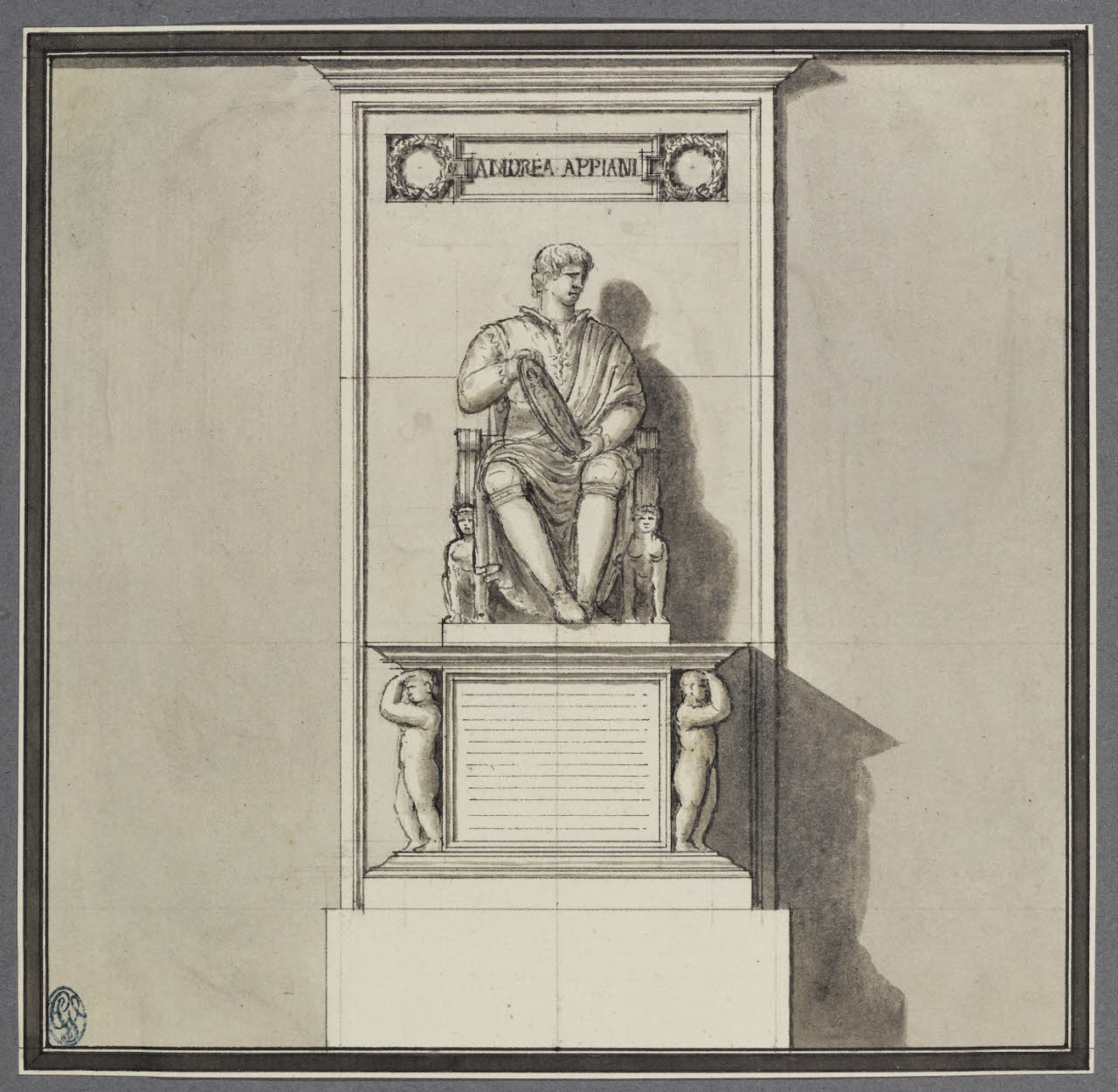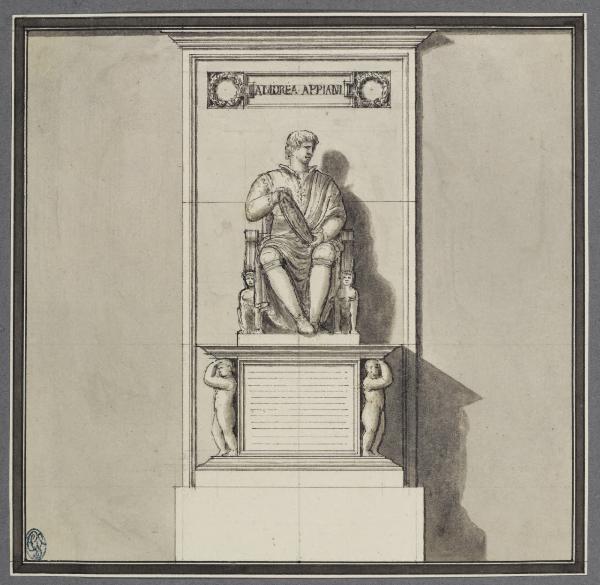 - NOTIZIE STORICO CRITICHE Il disegno fa parte di un album Vallardi del 1840, di dimensioni mm 352 x 460, sulla cui copertina in pelle marrone chiaro è incisa l'iscrizione in lettere capitali dorate "Paolo Landriani / milanese / e suoi contemporanei / nell'arte prospettica valentissimi / questi loro disegni / Giuseppe Vallardi / raccolse / per tramandare / co' passati maestri a' futuri / la stabile rinomanza / della scuola lombarda / l'anno MDCCCXL". Ogni singolo disegno è incollato a un foglio dell'album di carta di colore grigio-azzurro.\nColto da un ictus nel 1813, Andrea Appiani morì l'8 novembre 1817. Per l'occasione, Landriani fornì i disegni ideati per un monumento celebrativo da collocarsi all'Accademia di Brera. Nell'opera qui in analisi Appiani è seduto sullo scranno con la tavolozza in mano, come se fosse pronto ad accingersi a dipingere.