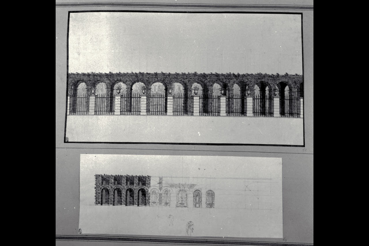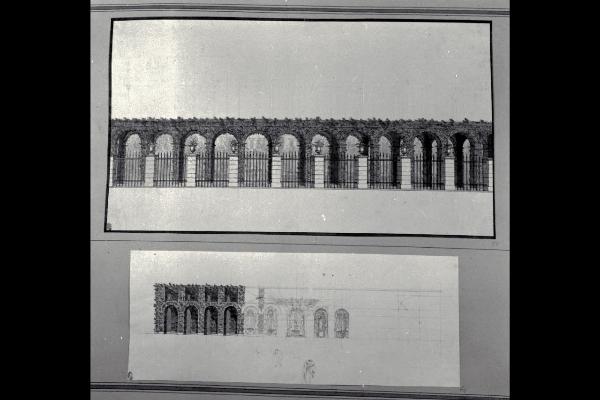 - NOTIZIE STORICO CRITICHE Il disegno fa parte di un album Vallardi del 1840, di dimensioni mm 561 x 735, sulla cui copertina in pelle marrone è incisa l'iscrizione in lettere capitali dorate "Paolo Landriani / milanese / e suoi contemporanei / nell'arte prospettica valentissimi. / Questi loro disegni / Giuseppe Vallardi / raccolse / per tramandare / co' passati maestri a' futuri / la stabile rinomanza / della scuola lombarda / l'anno MDCCCXL.". Ogni singolo disegno è incollato a un foglio dell'album, di carta grigia, presentante una cornice realizzata a penna e pennello e inchiostro sui toni del grigio.\nL'opera mostra analogie iconografiche con un altro studio per il cimitero di Porta Tosa conservato nello stesso album Vallardi D 14 (INVN 1084 L D,18).