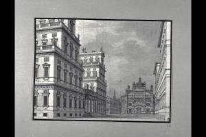 - NOTIZIE STORICO CRITICHE Il disegno fa parte di un album Vallardi del 1840, di dimensioni mm 561 x 735, sulla cui copertina in pelle marrone è incisa l'iscrizione in lettere capitali dorate "Paolo Landriani / milanese / e suoi contemporanei / nell'arte prospettica valentissimi. / Questi loro disegni / Giuseppe Vallardi / raccolse / per tramandare / co' passati maestri a' futuri / la stabile rinomanza / della scuola lombarda / l'anno MDCCCXL.". Ogni singolo disegno è incollato a un foglio dell'album, di carta grigia, presentante una cornice realizzata a penna e pennello e inchiostro sui toni del grigio.\nL'opera presenta analogie, soprattutto stilistiche, con scenografie e vedute di Paolo Landriani, conservate negli album Vallardi.
