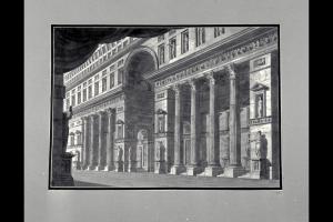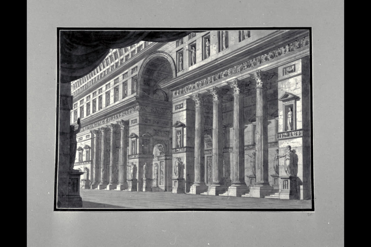 - NOTIZIE STORICO CRITICHE Il disegno fa parte di un album Vallardi del 1840, di dimensioni mm 561 x 735, sulla cui copertina in pelle marrone è incisa l'iscrizione in lettere capitali dorate "Paolo Landriani / milanese / e suoi contemporanei / nell'arte prospettica valentissimi. / Questi loro disegni / Giuseppe Vallardi / raccolse / per tramandare / co' passati maestri a' futuri / la stabile rinomanza / della scuola lombarda / l'anno MDCCCXL.". Ogni singolo disegno è incollato a un foglio dell'album, di carta grigia, presentante una cornice realizzata a penna e pennello e inchiostro sui toni del grigio.\nQuesta scena di repertorio, che ha un contraltare in un'incisione pubblicata nella "Raccolta di varie scene Teatrali eseguite da' più celebri Pittori teatrali in Milano" del 1825, viene sviluppata da Landriani tutta su di un fianco, lasciando libero l'intero campo centrale.
