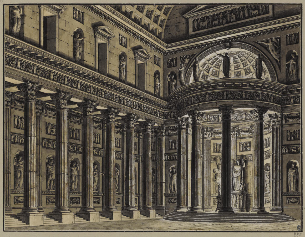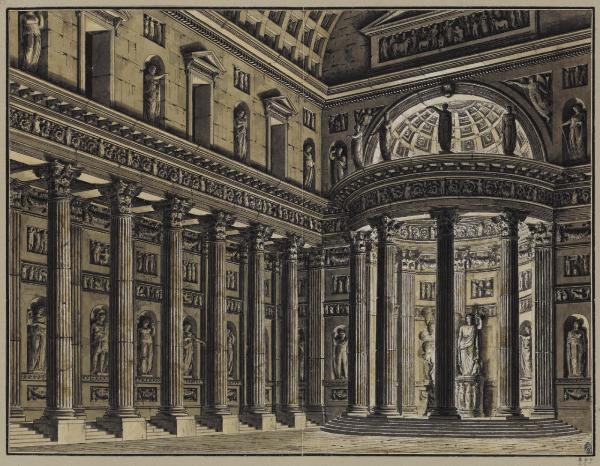 - NOTIZIE STORICO CRITICHE Il disegno fa parte di un album Vallardi del 1840, di dimensioni mm 561 x 735, sulla cui copertina in pelle marrone è incisa l'iscrizione in lettere capitali dorate "Paolo Landriani / milanese / e suoi contemporanei / nell'arte prospettica valentissimi. / Questi loro disegni / Giuseppe Vallardi / raccolse / per tramandare / co' passati maestri a' futuri / la stabile rinomanza / della scuola lombarda / l'anno MDCCCXL.". Ogni singolo disegno è incollato a un foglio dell'album, di carta grigia, presentante una cornice realizzata a penna e pennello e inchiostro sui toni del grigio.\nIl bozzetto teatrale è da riferirsi all'opera in due atti "Gli Sciti", su musica del piacentino Giuseppe Nicolini e libretto di Gaetano Rossi, andata in scena al Teatro alla Scala in occasione del Carnevale del 1799.