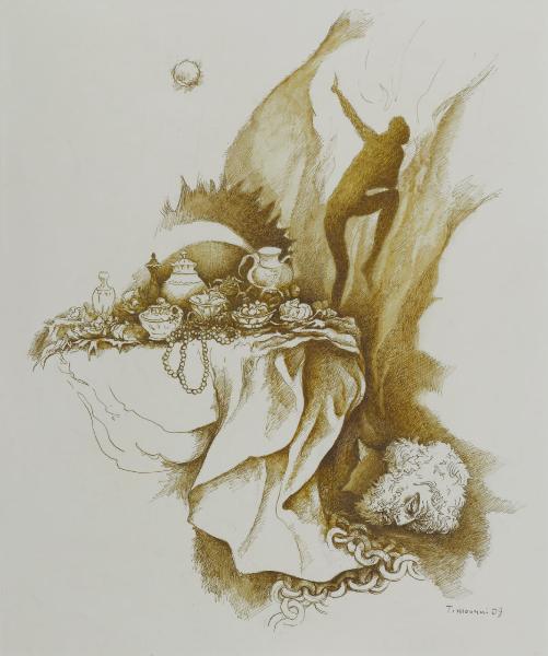 inchiostro a penna e acquerellature di inchiostro su carta