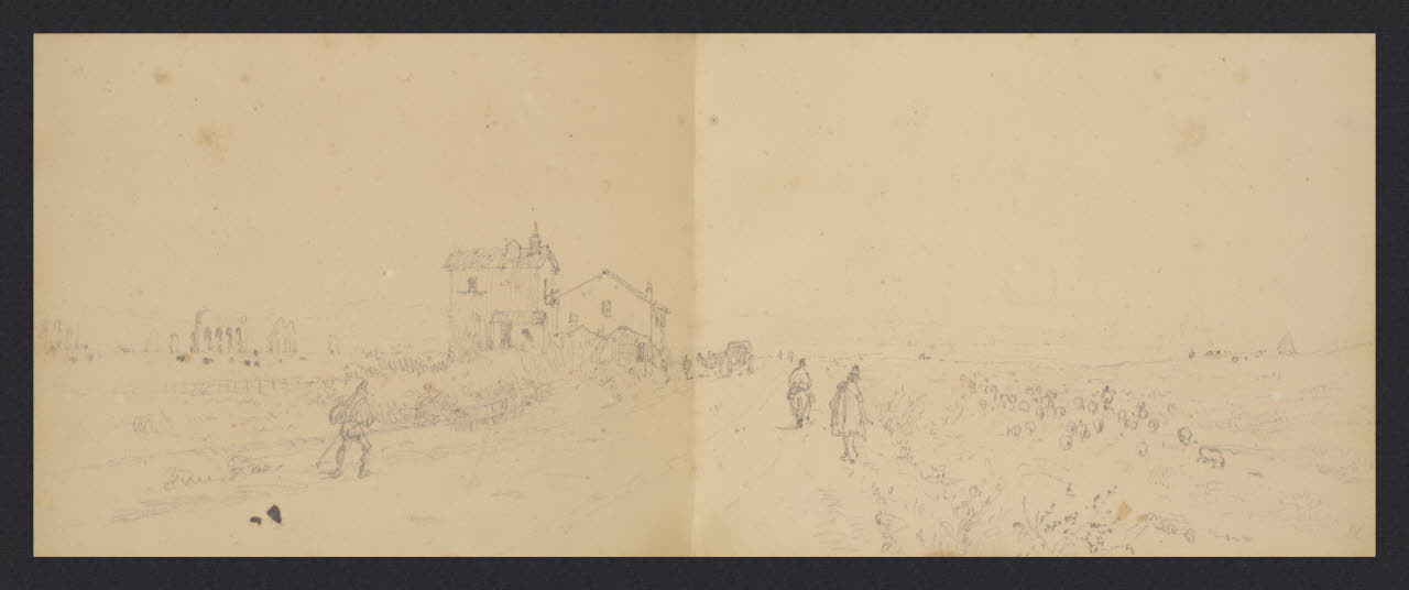 Album n. 8 - Roma - Livorno. Ampia veduta di campagna: strada, case, greggi, ruderi